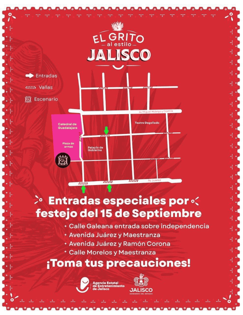 Cada 15 de septiembre, Guadalajara se llena de color, música y tradición para conmemorar el inicio de la independencia de México y el Centro Histórico se convierte en el corazón de la celebración con eventos culturales, gastronomía típica y el fervor patrio que distingue a esta fecha. Este año, el escenario principal se ubicará en Paseo Fray Antonio Alcalde, entre Morelos y Juárez, debido a las obras que actualmente se realizan en la Plaza Liberación.Las actividades comenzarán a las 18:00 horas con espectáculos artísticos y musicales, para culminar con la ceremonia del Grito de Independencia a las 21:00, seguida de juegos pirotécnicos y más conciertos.Para garantizar la seguridad de los asistentes, las autoridades han dispuesto operativos especiales de movilidad, transporte y vigilancia en la zona. Asimismo han habilitado accesos especiales a las zonas donde se desarrollarán los festejos patrios.De acuerdo con información compartida por el gobierno, se habilitarán cuatro accesos peatonales para ingresar al evento: En estos puntos se colocarán filtros de seguridad donde se revisarán pertenencias y no se permitirá el ingreso con objetos peligrosos, bebidas en envase de vidrio, pirotecnia, aerosoles ni drones.En cuanto al transporte, el Tren Ligero y el sistema Mi Macro Calzada extenderán su servicio hasta la medianoche. Algunas estaciones, como Guadalajara Centro de la Línea 3 y Plaza Universidad de la Línea 2, tendrán cierres temporales por motivos de seguridad. Se recomienda a quienes acudan planificar su traslado con anticipación, usar ropa y calzado cómodos, llevar agua, evitar mochilas grandes y acordar puntos de encuentro con familiares o amigos en caso de extravío. YC