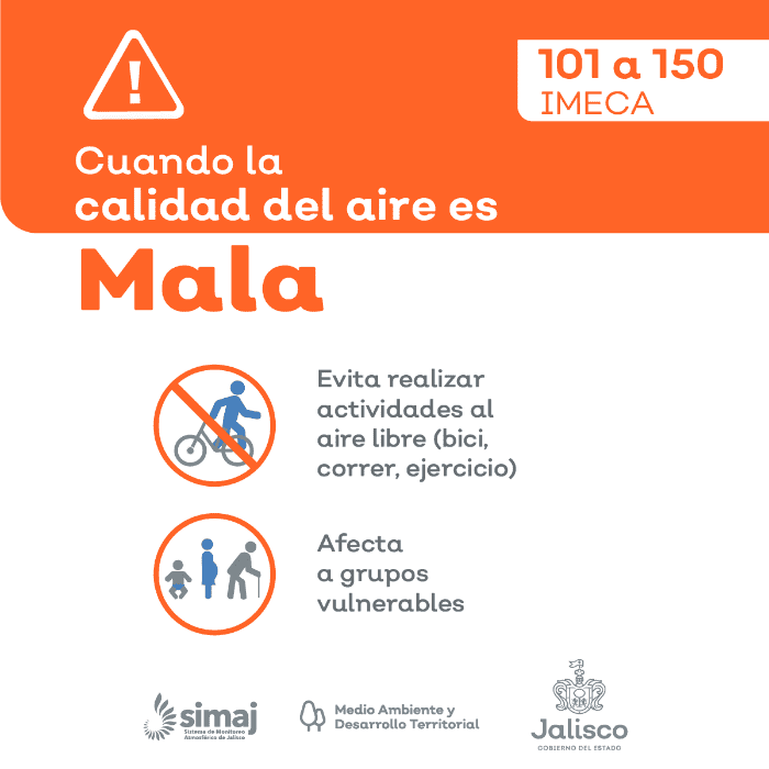 A través de su cuenta oficial de Twitter, el Sistema de Monitoreo Atmosférico de Jalisco (SIMAJ) compartió el estado actual de la calidad del aire en el Área Metropolitana de Guadalajara, la cual es mala debido a que alcanzó los 119 puntos IMECA a las 17:00 horas.LEE: Suman ocho incendios forestales que se encuentran activos en el EstadoEste alto nivel en el índice metropolitano de la calidad del aire se debe a los diferentes incendios forestales registrados en Jalisco. Ayer sumaban activos al menos ocho en Zapopan, Tapalpa, Cuautitlán de García Barragán, Talpa, Mascota y Atemajac de Brizuela-Chiquilistlán, siendo este último el más grande.De acuerdo con SEMADET, cuando los puntos IMECA van de los 101 a los 150, la calidad del aire se consiera mala y se recomienda a la población evitar realizar actividades al aire libre y proteger a los más vulnerables como menores de cinco años, personas con enfermedades respiratorias y adultos mayores.Entre las posibles afectaciones por la mala calidad del aire, de acuerdo a SEMADET, se encuentran:Si deseas mantenerte al tanto de las actualizaciones, te recomendamos ingresar al siguiente link:https://aire.jalisco.gob.mx/ YC