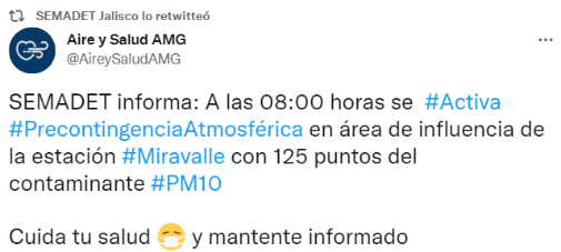 La jornada del último día del 2021 inició con mala calidad del aire, la Secretaría de Medio Ambiente (Semadet) informó que fue activada la precontingencia atmosférica en la zona de Miravalle donde la estación de monitoreo registró la mañana de este viernes hasta 126 puntos IMECA.Para disminuir la polución y proteger la salud se recomienda reducir el uso de vehículos automotores, evitar realizar acciones al aire libre y se prohíbe realizar quemas de cualquier tipo. Además, se sugiere tomar líquidos en abundancia y comer alimentos ricos en vitamina C.Con 104 puntos IMECA, la zona centro de Guadalajara tiene calidad del aire regular, Tlaquepaque registra 105 y Loma Dorada 103. En Las Pintas y Santa Fe reportan 116 y 119 puntos respectivamente.Durante este año la Zona Metropolitana de Guadalajara (ZMG) sumó cuatro veces más episodios de mala calidad del aire que en 2020, pues mientras que el año pasado hubo 16, este año ya son 68. De estos, 13 han sido contingencias atmosféricas fase I. El 24 de diciembre pasado la ZMG vivió su peor día con mala calidad del aire de todo el año.GC