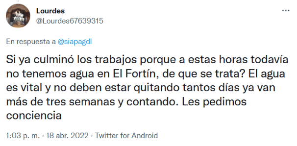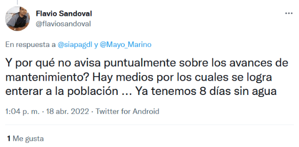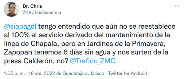 El Sistema Intermunicipal de los Servicios de Agua Potable y Alcantarillado (Siapa) realizó trabajos de mantenimiento de infraestructura hidráulica los días jueves 14 y viernes 15 de abril, como parte del “Operativo Semana Santa 2022” en el sistema de abastecimiento Chapala-Guadalajara, así como en la mayoría de sus instalaciones hidráulicas dentro de la ZMG. Esto tuvo un costo de 8.7 millones de pesos.Debido a estos trabajos, cientos de colonias se quedaron sin agua e, incluso, algunas aún no tienen.Los trabajos de mantenimiento se efectuaron en 34 puntos estratégicos que son de vital importancia para renovar y sustituir equipos obsoletos o dañados y así garantizar un funcionamiento óptimo en el abastecimiento y operación, así como mejorar los estándares de calidad que requiere el agua potable.Los puntos más importantes donde se trabajó para mantenimiento y renovación de equipos son:El organismo informó que, aunque los trabajos concluyeron este viernes en la noche, la recuperación del líquido sería gradual entre sábado y martes, pues las colonias más altas serían las últimas en recuperar el servicio. Mientras tanto, las quejas persisten entre los afectados.“@siapagdl tengo entendido que aún no se reestablece al 100% el servicio derivado del mantenimiento de la línea de Chapala, pero en Jardines de la Primavera, Zapopan tenemos 6 días sin agua y nos surten de la presa Calderón, no?”, preguntó un usuario de Twitter. “Si ya culminó los trabajos porque a estas horas todavía no tenemos agua en El Fortín, de que se trata? El agua es vital y no deben estar quitando tantos días ya van más de tres semanas y contando. Les pedimos conciencia”, señaló otra usuaria. “Por qué no avisa puntualmente sobre los avances de mantenimiento? Hay medios por los cuales se logra enterar a la población ... Ya tenemos 8 días sin agua”, afirmó otro más.GC