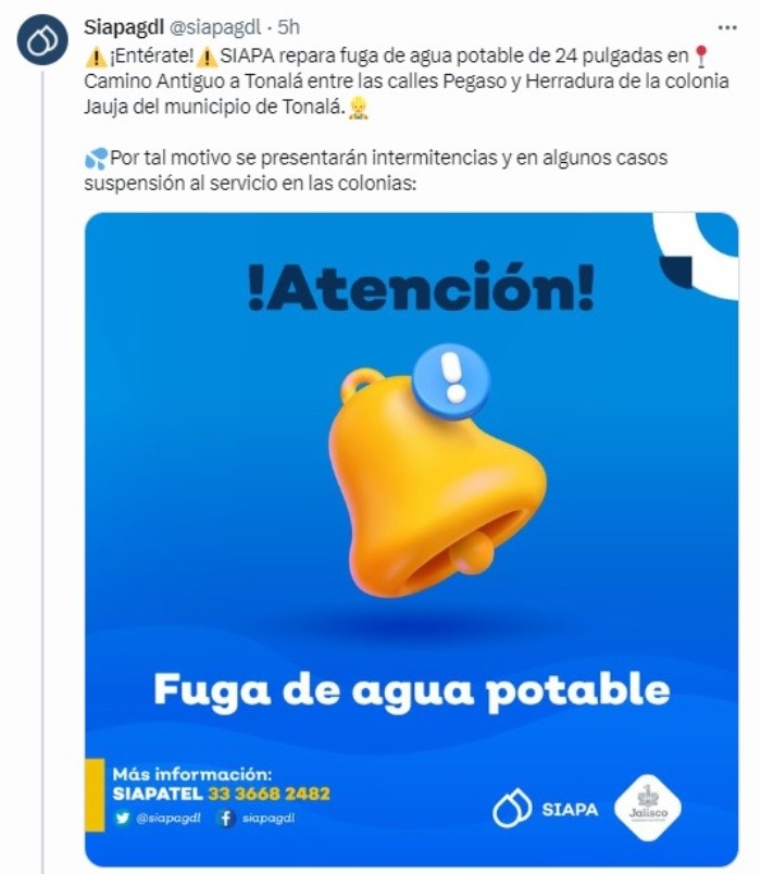 El Sistema Intermunicipal de los Servicios Agua Potable y Alcantarillado (Siapa) dio a conocer que habrá corte de agua en 27 colonias del municipio de Tonalá, por lo que hizo una llamado a los ciudadanos a tomar precauciones.A través de su cuenta de Twitter, el Siapa reportó que se encuentran reparando una fuga de agua de 24 pulgadas en Camino Antiguo a Tonalá entre las calles Pegaso y Herradura de la colonia Jauja de dicho municipio.Por este motivo se suspenderá el servicio de agua durante todo este fin de semana en las siguientes colonias: El servicio de agua potable se restablecerá durante el transcurso del domingo 9 de julio. En caso de cualquier duda o aclaración, el Siapa pone a disposición los siguientes medios para que resuelvas tus preguntas.MF
