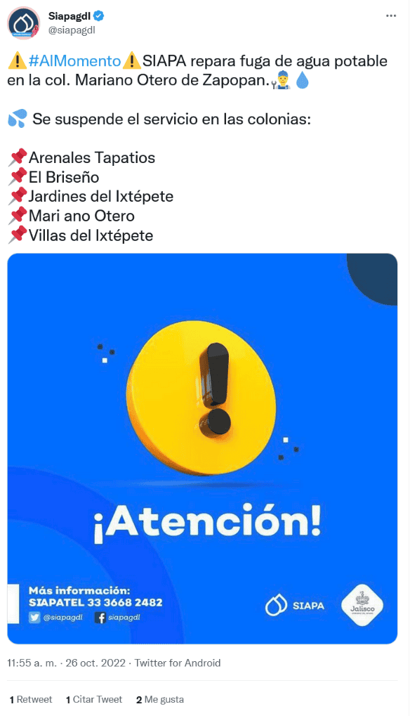 El Sistema Intermunicipal de los Servicios de Agua Potable y Alcantarillado (SIAPA) anunció la mañana de hoy miércoles que habrá corte de agua para algunas colonias del municipio de Zapopan.A través de redes sociales, el SIAPA informó que personal repara una fuga de agua potable en la colonia Mariano Otero, lo que provocará los cortes de agua en cinco colonias del municipio.Se prevé que el servicio del agua regrese durante la mañana del jueves 26 de octubre. ZapopanEl SIAPA invitó a la gente a realizar distintas acciones para el uso responsable y óptimo del aguaAnte cualquier duda o aclaración, el SIAPA pone a disposición los siguientes medios para que resuelvas tus preguntas. Facebook: siapagdl Twitter: siapagdl SIAPATEL: 3336682482GC