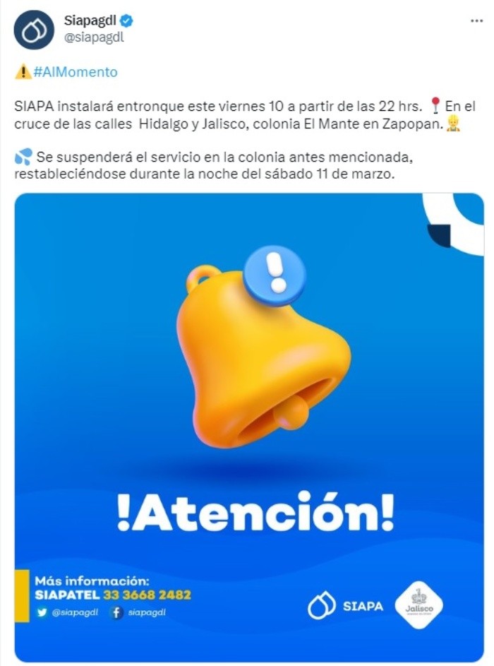 El Sistema Intermunicipal de los Servicios Agua Potable y Alcantarillado (Siapa) informó que suspenderá el servicio de agua potable en una colonia del municipio de Zapopan debido a que se instalará un entronque. A través de las redes sociales del Siapa se mencionó que se instalará el entronque este viernes 10 a partir de las 22:00 horas en el cruce de las calles Hidalgo y Jalisco, en la colonia El Mante en Zapopan. Por tal motivo habrá corte de agua en la colonia antes mencionada de dicho municipio. El servicio regresará a su normalidad durante la noche del sábado 11 de marzo. En caso de cualquier duda o alguna aclaración, el Siapa pone a disposición los siguientes medios para que resuelvas tus preguntas.MF