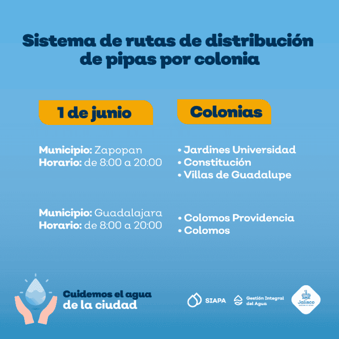 Ante la baja presión de agua que prevalece en algunas colonias de la Zona Metropolitana de Guadalajara (ZMG), el Sistema Intermunicipal de los Servicios de Agua Potable y Alcantarillado (SIAPA) continúa con el sistema de rutas de pipas gratuitas implementado desde el pasado 18 marzo. Este día se atenderá a cinco colonias de Guadalajara y Zapopan.La distribución de pipas tiene el objetivo de minimizar las afectaciones a las colonias que se encuentran dentro del operativo de suministro rotatorio, estrategia diseñada debido a la escasez de agua en la Presa Calderón.Las zonas de cobertura y horarios de la flota de pipas para este martes 1 de junio son los siguientes:La distribución estará dentro de un horario de 08:00 a 20:00 horas. Ante el desabasto de agua el SIAPA exhorta a cuidar el vital líquido.El SIAPA informó además que ha colocado 143 cisternas comunitarias, de 10 mil litros de capacidad, en colonias de las zonas altas que cada año han tenido deficiencias en el servicio: 116 Zapopan, 13 en Guadalajara, 11 en Tonalá y tres en Tlaquepaque. Para consultar la ubicación de cisternas se puede ingresar a: gobjal.mx/Cisternas. Para solicitar el servicio de pipas gratuitas se requiere:También se puede llamar a la línea telefónica SIAPATEL 3668-2482 con atención las 24 horas del día.Asimismo, el SIAPA pone a disposición sus redes sociales en Twitter: @siapagl y Facebook: siapagdl para brindar informado sobre el sistema de rutas de distribución de pipas gratuitas por colonia y el SIAPATEL para denuncias (33 3668 2482).NR