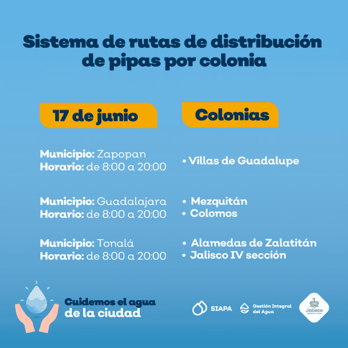 Ante la baja presión de agua que prevalece en algunas colonias de la Zona Metropolitana de Guadalajara (ZMG), el Sistema Intermunicipal de los Servicios de Agua Potable y Alcantarillado (SIAPA) continúa con el sistema de rutas de pipas gratuitas implementado desde el pasado 18 marzo. Este día se atenderá a cinco colonias de Tonalá, Guadalajara y Zapopan.La distribución de pipas tiene el objetivo de minimizar las afectaciones a las colonias que se encuentran dentro del operativo de suministro rotatorio, estrategia diseñada debido a la escasez de agua en la Presa Calderón.Las zonas de cobertura y horarios de la flota de pipas para este jueves 17 de junio son los siguientes:La distribución estará dentro de un horario de 08:00 a 20:00 horas. Ante el desabasto de agua el SIAPA exhorta a cuidar el vital líquido.El SIAPA informó además que ha colocado 143 cisternas comunitarias, de 10 mil litros de capacidad, en colonias de las zonas altas que cada año han tenido deficiencias en el servicio: 116 Zapopan, 13 en Guadalajara, 11 en Tonalá y tres en Tlaquepaque. Para consultar la ubicación de cisternas se puede ingresar a: gobjal.mx/Cisternas. Para solicitar el servicio de pipas gratuitas se requiere:También se puede llamar a la línea telefónica SIAPATEL 3668-2482 con atención las 24 horas del día.Asimismo, el SIAPA pone a disposición sus redes sociales en Twitter: @siapagl y Facebook: siapagdl para brindar informado sobre el sistema de rutas de distribución de pipas gratuitas por colonia y el SIAPATEL para denuncias (33 3668 2482).NR