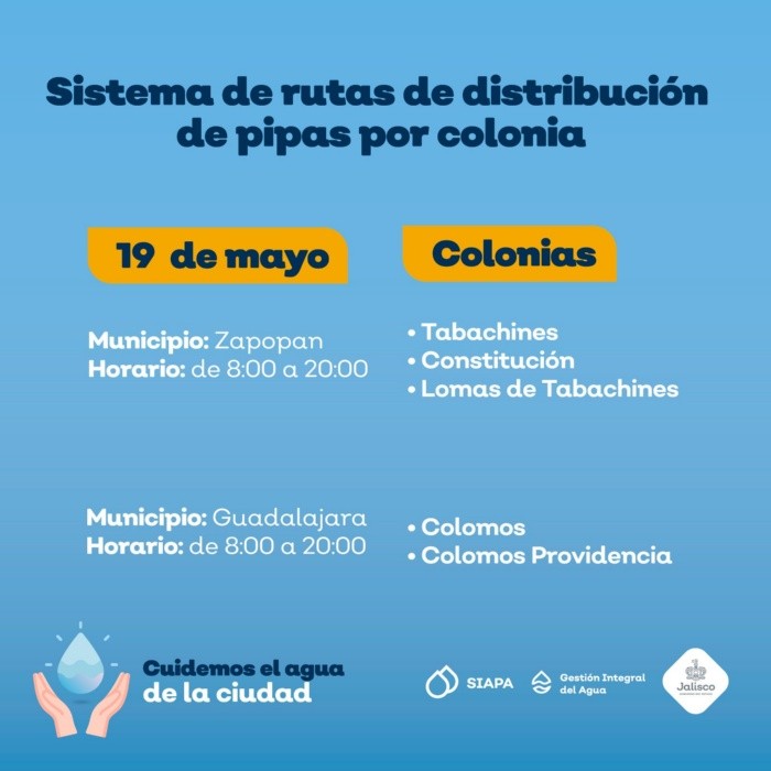 Ante la baja presión de agua que prevalece en algunas colonias de la Zona Metropolitana de Guadalajara (ZMG), el Sistema Intermunicipal de los Servicios de Agua Potable y Alcantarillado (SIAPA) continúa con el sistema de rutas de pipas gratuitas implementado desde el pasado 18 marzo. Este día se atenderá a cinco colonias de Guadalajara y Zapopan.La distribución de pipas tiene el objetivo de minimizar las afectaciones a las colonias que se encuentran dentro del operativo de suministro rotatorio, estrategia diseñada debido a la escasez de agua en la Presa Calderón.Las zonas de cobertura y horarios de la flota de pipas para este miércoles 19 de mayo son los siguientes:La distribución estará dentro de un horario de 08:00 a 20:00 horas. Ante el desabasto de agua el SIAPA exhorta a cuidar el vital líquido.El SIAPA informó además que ha colocado 143 cisternas comunitarias, de 10 mil litros de capacidad, en colonias de las zonas altas que cada año han tenido deficiencias en el servicio: 116 Zapopan, 13 en Guadalajara, 11 en Tonalá y tres en Tlaquepaque. Para consultar la ubicación de cisternas se puede ingresar a: gobjal.mx/Cisternas.Para solicitar el servicio de pipas gratuitas se requiere:Asimismo, el SIAPA pone a disposición sus redes sociales en Twitter: @siapagl y Facebook: siapagdl para brindar informado sobre el sistema de rutas de distribución de pipas gratuitas por colonia y el SIAPATEL para denuncias (33 3668 2482).NR