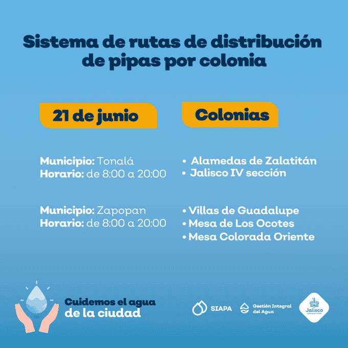 El Sistema Intermunicipal de los Servicios de Agua Potable y Alcantarillado (SIAPA) continúa con el sistema de rutas de pipas gratuitas por colonia implementado desde el pasado 18 de marzo, debido a que prevalece la baja presión de agua en algunas áreas de la Zona Metropolitana de Guadalajara (ZMG).Este día la flota de pipas acudirá a cinco colonias de los municipios de Zapopan y Tonalá.La distribución de pipas tiene el objetivo de minimizar las afectaciones a las colonias que se encuentran dentro del operativo de suministro rotatorio, estrategia diseñada debido a la escasez de agua en la Presa Calderón.Las zonas de cobertura y horarios de la flota de pipas para este viernes 18 de junio son los siguientes:La distribución estará dentro de un horario de 08:00 a 20:00 horas. Ante el desabasto de agua el SIAPA exhorta a cuidar el vital líquido.Además, el SIAPA que ha colocado 143 cisternas comunitarias, de 10 mil litros de capacidad, en colonias de las zonas altas que cada año han tenido deficiencias en el servicio: 116 Zapopan, 13 en Guadalajara, 11 en Tonalá y tres en Tlaquepaque. Para consultar la ubicación de cisternas se puede ingresar a: gobjal.mx/Cisternas. Para solicitar el servicio de pipas gratuitas se requiere:También se puede llamar a la línea telefónica SIAPATEL 3668-2482 con atención las 24 horas del día.Asimismo, el SIAPA pone a disposición sus redes sociales en Twitter: @siapagl y Facebook: siapagdl para brindar informado sobre el sistema de rutas de distribución de pipas gratuitas por colonia y el SIAPATEL para denuncias (33 3668 2482).GC