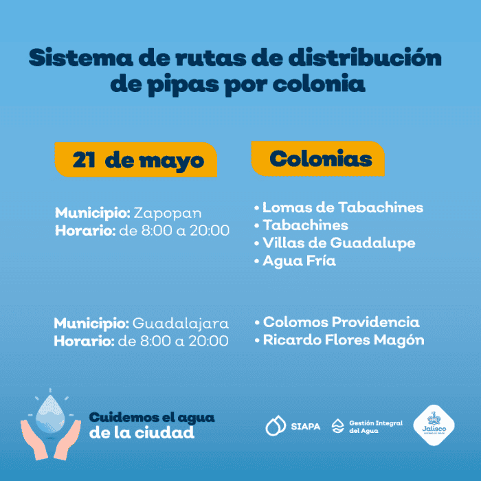 El Sistema Intermunicipal de los Servicios de Agua Potable y Alcantarillado (SIAPA) continúa con el sistema de rutas de pipas gratuitas por colonia implementado desde el pasado 18 de marzo, debido a que prevalece la baja presión de agua en algunas áreas de la Zona Metropolitana de Guadalajara (ZMG).Este día la flota de pipas acudirá a seis colonias de los municipios de Zapopan y Guadalajara.La distribución de pipas tiene el objetivo de minimizar las afectaciones a las colonias que se encuentran dentro del operativo de suministro rotatorio, estrategia diseñada debido a la escasez de agua en la Presa Calderón.Las zonas de cobertura y horarios de la flota de pipas para este viernes 21 de mayo son los siguientes:La distribución estará dentro de un horario de 08:00 a 20:00 horas. Ante el desabasto de agua el SIAPA exhorta a cuidar el vital líquido.El SIAPA informó además que ha colocado 143 cisternas comunitarias, de 10 mil litros de capacidad, en colonias de las zonas altas que cada año han tenido deficiencias en el servicio: 116 Zapopan, 13 en Guadalajara, 11 en Tonalá y tres en Tlaquepaque. Para consultar la ubicación de cisternas se puede ingresar a: gobjal.mx/Cisternas.Para solicitar el servicio de pipas gratuitas se requiere:También se puede llamar a la línea telefónica SIAPATEL 3668-2482 con atención las 24 horas del día.Asimismo, el SIAPA pone a disposición sus redes sociales en Twitter: @siapagl y Facebook: siapagdl para brindar informado sobre el sistema de rutas de distribución de pipas gratuitas por colonia y el SIAPATEL para denuncias (33 3668 2482).NR