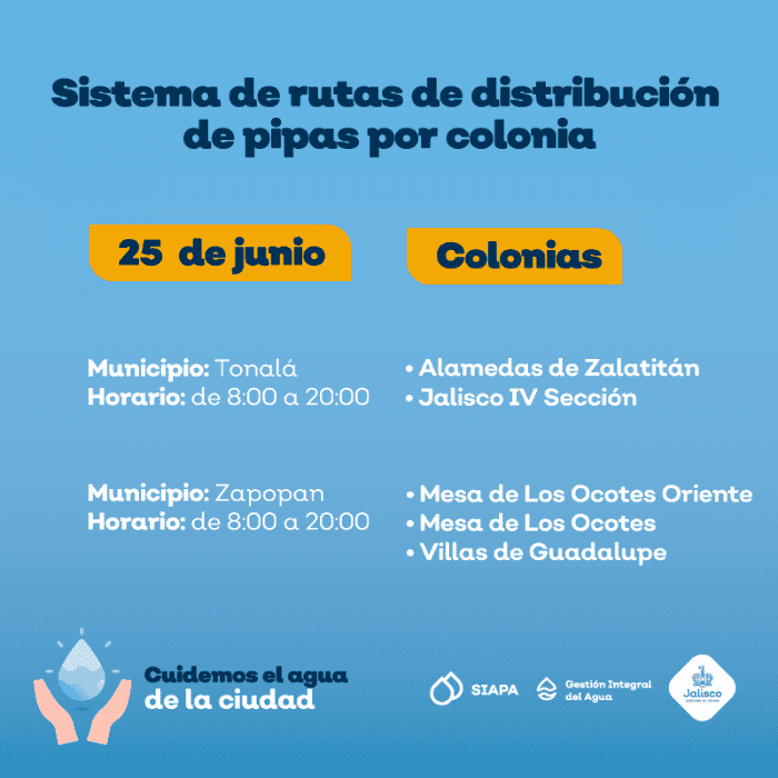 El Sistema Intermunicipal de los Servicios de Agua Potable y Alcantarillado (SIAPA) continúa con el sistema de rutas de pipas gratuitas por colonia implementado desde el pasado 18 de marzo, debido a que prevalece la baja presión de agua en algunas áreas de la Zona Metropolitana de Guadalajara (ZMG).Este día la flota de pipas acudirá a cinco colonias de los municipios de Zapopan y Tonalá.La distribución de pipas tiene el objetivo de minimizar las afectaciones a las colonias que se encuentran dentro del operativo de suministro rotatorio, estrategia diseñada debido a la escasez de agua en la Presa Calderón.Las zonas de cobertura y horarios de la flota de pipas para este viernes 25 de junio son los siguientes:La distribución estará dentro de un horario de 08:00 a 20:00 horas. Ante el desabasto de agua el SIAPA exhorta a cuidar el vital líquido.Además, el SIAPA que ha colocado 143 cisternas comunitarias, de 10 mil litros de capacidad, en colonias de las zonas altas que cada año han tenido deficiencias en el servicio: 116 Zapopan, 13 en Guadalajara, 11 en Tonalá y tres en Tlaquepaque. Para consultar la ubicación de cisternas se puede ingresar a: gobjal.mx/Cisternas. Para solicitar el servicio de pipas gratuitas se requiere:También se puede llamar a la línea telefónica SIAPATEL 3668-2482 con atención las 24 horas del día.Asimismo, el SIAPA pone a disposición sus redes sociales en Twitter: @siapagl y Facebook: siapagdl para brindar informado sobre el sistema de rutas de distribución de pipas gratuitas por colonia y el SIAPATEL para denuncias (33 3668 2482).NR