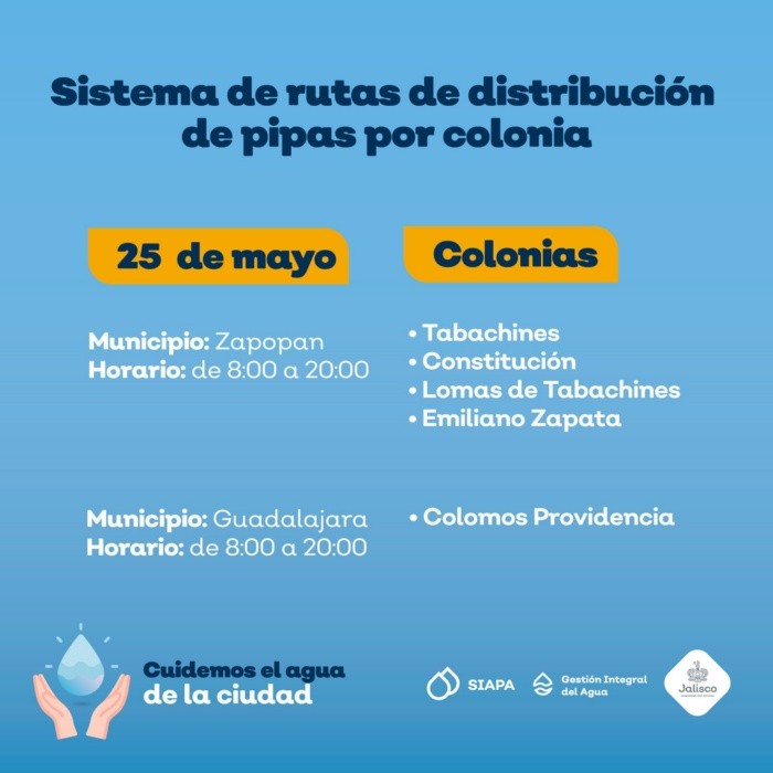 El Sistema Intermunicipal de los Servicios de Agua Potable y Alcantarillado (SIAPA) continúa con el sistema de rutas de pipas gratuitas por colonia implementado desde el pasado 18 de marzo, debido a que prevalece la baja presión de agua en algunas áreas de la Zona Metropolitana de Guadalajara (ZMG).Este día la flota de pipas acudirá a cinco colonias de los municipio de Zapopan y Guadalajara.La distribución de pipas tiene el objetivo de minimizar las afectaciones a las colonias que se encuentran dentro del operativo de suministro rotatorio, estrategia diseñada debido a la escasez de agua en la Presa Calderón.Las zonas de cobertura y horarios de la flota de pipas para este martes 25 de mayo son los siguientes:La distribución estará dentro de un horario de 08:00 a 20:00 horas. Ante el desabasto de agua el SIAPA exhorta a cuidar el vital líquido.El SIAPA informó además que ha colocado 143 cisternas comunitarias, de 10 mil litros de capacidad, en colonias de las zonas altas que cada año han tenido deficiencias en el servicio: 116 Zapopan, 13 en Guadalajara, 11 en Tonalá y tres en Tlaquepaque. Para consultar la ubicación de cisternas se puede ingresar a: gobjal.mx/Cisternas.Para solicitar el servicio de pipas gratuitas se requiere:También se puede llamar a la línea telefónica SIAPATEL 3668-2482 con atención las 24 horas del día.Asimismo, el SIAPA pone a disposición sus redes sociales en Twitter: @siapagl y Facebook: siapagdl para brindar informado sobre el sistema de rutas de distribución de pipas gratuitas por colonia y el SIAPATEL para denuncias (33 3668 2482).NR