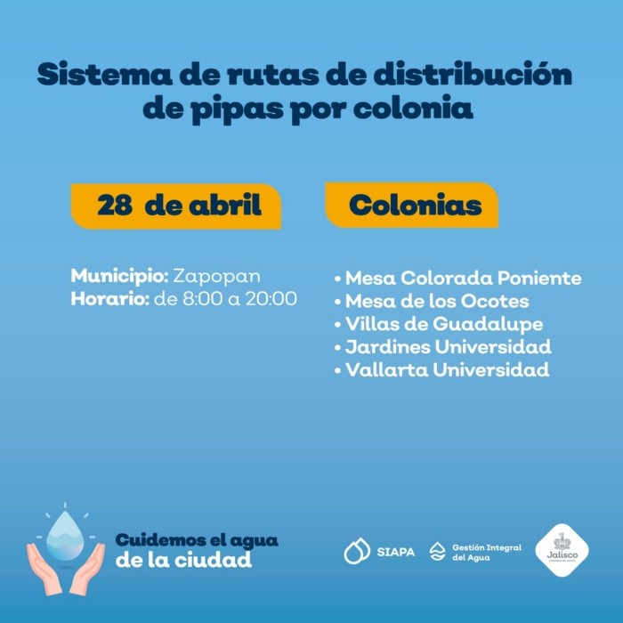 El Sistema Intermunicipal de los Servicios de Agua Potable y Alcantarillado (SIAPA) continúa con el sistema de rutas de pipas gratuitas por colonia implementado desde el pasado 18 de marzo, debido a que prevalece la baja presión de agua en algunas áreas de la Zona Metropolitana de Guadalajara (ZMG).Este día la flota de pipas acudirá a cinco colonias del municipio de Zapopan.La distribución de pipas tiene el objetivo de mitigar las afectaciones de las colonias que se encuentran dentro del operativo de suministro rotatorio, estrategia de distribución diseñada debido a la escasez de agua en la Presa Calderón.Las zonas de cobertura y horarios de la flota de pipas para este miércoles 28 de abril es el siguiente:La distribución estará dentro de un horario de 08:00 a 20:00 horas. Ante el desabasto de agua el SIAPA exhorta a cuidar el vital líquido.Para solicitar el servicio de pipas gratuitas se requiere:También se puede llamar a la línea telefónica SIAPATEL 3668-2482 con atención las 24 horas del día o a través de las redes sociales oficiales Facebook: Siapagdl y Twitter: @siapagdl.NR