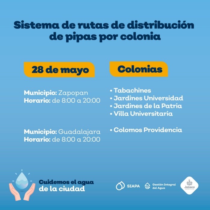 Ante la baja presión de agua que prevalece en algunas colonias de la Zona Metropolitana de Guadalajara (ZMG), el Sistema Intermunicipal de los Servicios de Agua Potable y Alcantarillado (SIAPA) continúa con el sistema de rutas de pipas gratuitas implementado desde el pasado 18 marzo. Este día se atenderá a cinco colonias de Guadalajara y Zapopan.La distribución de pipas tiene el objetivo de minimizar las afectaciones a las colonias que se encuentran dentro del operativo de suministro rotatorio, estrategia diseñada debido a la escasez de agua en la Presa Calderón.Las zonas de cobertura y horarios de la flota de pipas para este viernes 28 de mayo son los siguientes:La distribución estará dentro de un horario de 08:00 a 20:00 horas. Ante el desabasto de agua el SIAPA exhorta a cuidar el vital líquido.El SIAPA informó además que ha colocado 143 cisternas comunitarias, de 10 mil litros de capacidad, en colonias de las zonas altas que cada año han tenido deficiencias en el servicio: 116 Zapopan, 13 en Guadalajara, 11 en Tonalá y tres en Tlaquepaque. Para consultar la ubicación de cisternas se puede ingresar a: gobjal.mx/Cisternas.Para solicitar el servicio de pipas gratuitas se requiere:También se puede llamar a la línea telefónica SIAPATEL 3668-2482 con atención las 24 horas del día.Asimismo, el SIAPA pone a disposición sus redes sociales en Twitter: @siapagl y Facebook: siapagdl para brindar informado sobre el sistema de rutas de distribución de pipas gratuitas por colonia y el SIAPATEL para denuncias (33 3668 2482).NR