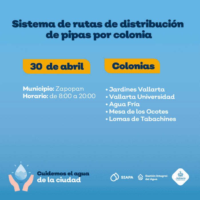 El Sistema Intermunicipal de los Servicios de Agua Potable y Alcantarillado (SIAPA) continúa con el sistema de rutas de pipas gratuitas por colonia implementado desde el pasado 18 de marzo, debido a que prevalece la baja presión de agua en algunas áreas de la Zona Metropolitana de Guadalajara (ZMG).Este día la flota de pipas acudirá a cinco colonias del municipio de Zapopan.La distribución de pipas tiene el objetivo de mitigar las afectaciones de las colonias que se encuentran dentro del operativo de suministro rotatorio, estrategia de distribución diseñada debido a la escasez de agua en la Presa Calderón.Las zonas de cobertura y horarios de la flota de pipas para este viernes 30 de abril son los siguientes:La distribución estará dentro de un horario de 08:00 a 20:00 horas. Ante el desabasto de agua el SIAPA exhorta a cuidar el vital líquido.Para solicitar el servicio de pipas gratuitas se requiere:También se puede llamar a la línea telefónica SIAPATEL 3668-2482 con atención las 24 horas del día o a través de las redes sociales oficiales Facebook: Siapagdl y Twitter: @siapagdl.NR
