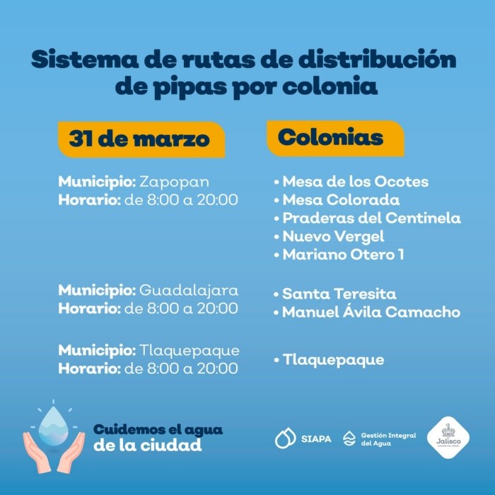 Ante la baja presión de agua que prevalece en algunas colonias de la Zona Metropolitana de Guadalajara (ZMG), el Sistema Intermunicipal de los Servicios de Agua Potable y Alcantarillado (SIAPA) continúa con el sistema de rutas de pipas gratuitas por colonia implementado desde el pasado 18 de marzo.La distribución de pipas tiene el objetivo de minimizar las afectaciones a las colonias que se encuentran dentro del operativo de suministro rotatorio. Las zonas de cobertura y horarios de la flota de pipas para este miércoles 31 de marzo es el siguiente:La distribución estará dentro de un horario de 8:00 a 20:00 en todos los municipios. Ante el desabasto el SIAPA recomienda cuidar el vital líquido.NR