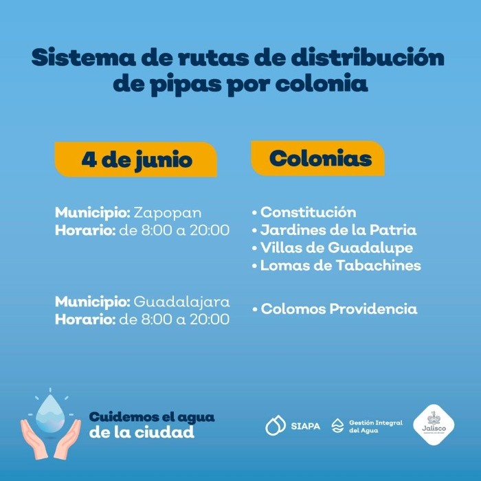 El Sistema Intermunicipal de los Servicios de Agua Potable y Alcantarillado (SIAPA) continúa con el sistema de rutas de pipas gratuitas por colonia implementado desde el pasado 18 de marzo, debido a que prevalece la baja presión de agua en algunas áreas de la Zona Metropolitana de Guadalajara (ZMG).Este día la flota de pipas acudirá a cinco colonias de los municipios de Zapopan y Guadalajara.La distribución de pipas tiene el objetivo de minimizar las afectaciones a las colonias que se encuentran dentro del operativo de suministro rotatorio, estrategia diseñada debido a la escasez de agua en la Presa Calderón.Las zonas de cobertura y horarios de la flota de pipas para este viernes 4 de junio son los siguientes:La distribución estará dentro de un horario de 08:00 a 20:00 horas. Ante el desabasto de agua el SIAPA exhorta a cuidar el vital líquido.El SIAPA informó además que ha colocado 143 cisternas comunitarias, de 10 mil litros de capacidad, en colonias de las zonas altas que cada año han tenido deficiencias en el servicio: 116 Zapopan, 13 en Guadalajara, 11 en Tonalá y tres en Tlaquepaque. Para consultar la ubicación de cisternas se puede ingresar a: gobjal.mx/Cisternas. Para solicitar el servicio de pipas gratuitas se requiere:También se puede llamar a la línea telefónica SIAPATEL 3668-2482 con atención las 24 horas del día.Asimismo, el SIAPA pone a disposición sus redes sociales en Twitter: @siapagl y Facebook: siapagdl para brindar informado sobre el sistema de rutas de distribución de pipas gratuitas por colonia y el SIAPATEL para denuncias (33 3668 2482).NR