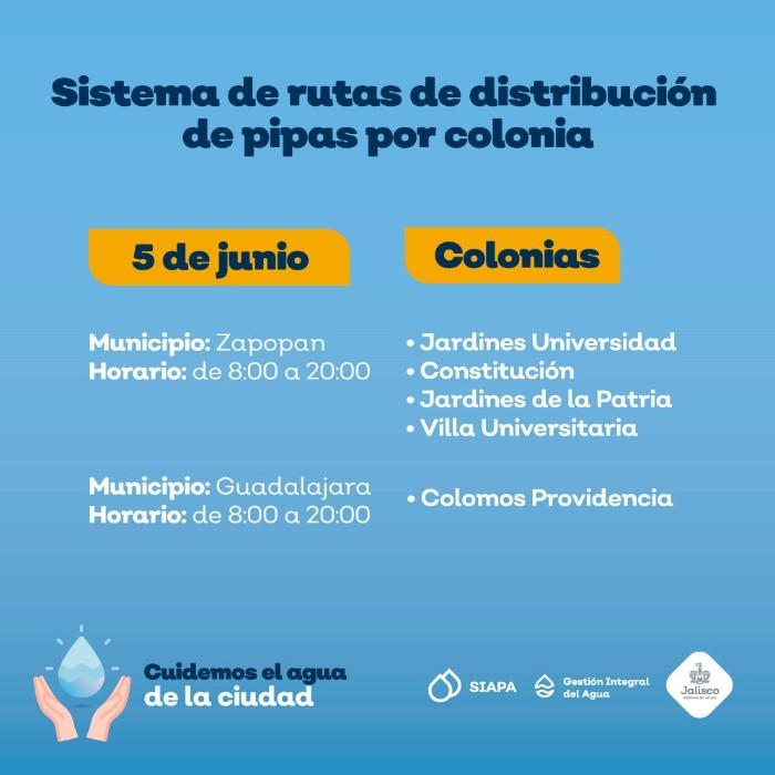 Ante la baja presión de agua que prevalece en algunas colonias de la Zona Metropolitana de Guadalajara (ZMG), el Sistema Intermunicipal de los Servicios de Agua Potable y Alcantarillado (SIAPA) continúa con el sistema de rutas de pipas gratuitas implementado desde el pasado 18 marzo. Este día se atenderá a cinco colonias de Guadalajara y Zapopan.La distribución de pipas tiene el objetivo de minimizar las afectaciones a las colonias que se encuentran dentro del operativo de suministro rotatorio, estrategia diseñada debido a la escasez de agua en la Presa Calderón.Las zonas de cobertura y horarios de la flota de pipas para este sábado 5 de junio son los siguientes:La distribución estará dentro de un horario de 08:00 a 20:00 horas. Ante el desabasto de agua el SIAPA exhorta a cuidar el vital líquido.El SIAPA informó además que ha colocado 143 cisternas comunitarias, de 10 mil litros de capacidad, en colonias de las zonas altas que cada año han tenido deficiencias en el servicio: 116 Zapopan, 13 en Guadalajara, 11 en Tonalá y tres en Tlaquepaque. Para consultar la ubicación de cisternas se puede ingresar a: gobjal.mx/Cisternas.Para solicitar el servicio de pipas gratuitas se requiere:También se puede llamar a la línea telefónica SIAPATEL 3668-2482 con atención las 24 horas del día.Asimismo, el SIAPA pone a disposición sus redes sociales en Twitter: @siapagl y Facebook: siapagdl para brindar informado sobre el sistema de rutas de distribución de pipas gratuitas por colonia y el SIAPATEL para denuncias (33 3668 2482).NR