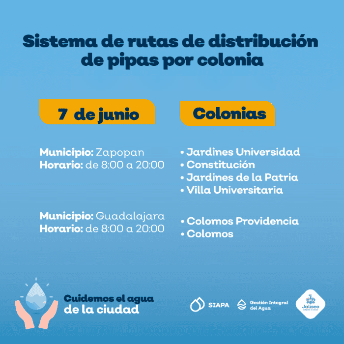 Ante la baja presión de agua que prevalece en algunas colonias de la Zona Metropolitana de Guadalajara (ZMG), el Sistema Intermunicipal de los Servicios de Agua Potable y Alcantarillado (SIAPA) continúa con el sistema de rutas de pipas gratuitas implementado desde el pasado 18 marzo. Este día se atenderá a cinco colonias de Guadalajara y Zapopan.La distribución de pipas tiene el objetivo de minimizar las afectaciones a las colonias que se encuentran dentro del operativo de suministro rotatorio, estrategia diseñada debido a la escasez de agua en la Presa Calderón.Las zonas de cobertura y horarios de la flota de pipas para este lunes 7 de junio son los siguientes:La distribución estará dentro de un horario de 08:00 a 20:00 horas. Ante el desabasto de agua el SIAPA exhorta a cuidar el vital líquido.El SIAPA informó además que ha colocado 143 cisternas comunitarias, de 10 mil litros de capacidad, en colonias de las zonas altas que cada año han tenido deficiencias en el servicio: 116 Zapopan, 13 en Guadalajara, 11 en Tonalá y tres en Tlaquepaque. Para consultar la ubicación de cisternas se puede ingresar a: gobjal.mx/Cisternas.Para solicitar el servicio de pipas gratuitas se requiere:También se puede llamar a la línea telefónica SIAPATEL 3668-2482 con atención las 24 horas del día.Asimismo, el SIAPA pone a disposición sus redes sociales en Twitter: @siapagl y Facebook: siapagdl para brindar informado sobre el sistema de rutas de distribución de pipas gratuitas por colonia y el SIAPATEL para denuncias (33 3668 2482).GC