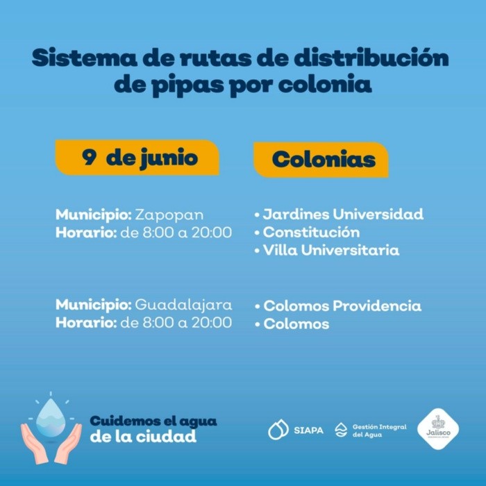 Ante la baja presión de agua que prevalece en algunas colonias de la Zona Metropolitana de Guadalajara (ZMG), el Sistema Intermunicipal de los Servicios de Agua Potable y Alcantarillado (SIAPA) continúa con el sistema de rutas de pipas gratuitas implementado desde el pasado 18 marzo. Este día se atenderá a cinco colonias de Guadalajara y Zapopan.La distribución de pipas tiene el objetivo de minimizar las afectaciones a las colonias que se encuentran dentro del operativo de suministro rotatorio, estrategia diseñada debido a la escasez de agua en la Presa Calderón.Las zonas de cobertura y horarios de la flota de pipas para este miércoles 9 de junio son los siguientes:La distribución estará dentro de un horario de 08:00 a 20:00 horas. Ante el desabasto de agua el SIAPA exhorta a cuidar el vital líquido.El SIAPA informó además que ha colocado 143 cisternas comunitarias, de 10 mil litros de capacidad, en colonias de las zonas altas que cada año han tenido deficiencias en el servicio: 116 Zapopan, 13 en Guadalajara, 11 en Tonalá y tres en Tlaquepaque. Para consultar la ubicación de cisternas se puede ingresar a: gobjal.mx/Cisternas.Para solicitar el servicio de pipas gratuitas se requiere:También se puede llamar a la línea telefónica SIAPATEL 3668-2482 con atención las 24 horas del día.Asimismo, el SIAPA pone a disposición sus redes sociales en Twitter: @siapagl y Facebook: siapagdl para brindar informado sobre el sistema de rutas de distribución de pipas gratuitas por colonia y el SIAPATEL para denuncias (33 3668 2482).NR