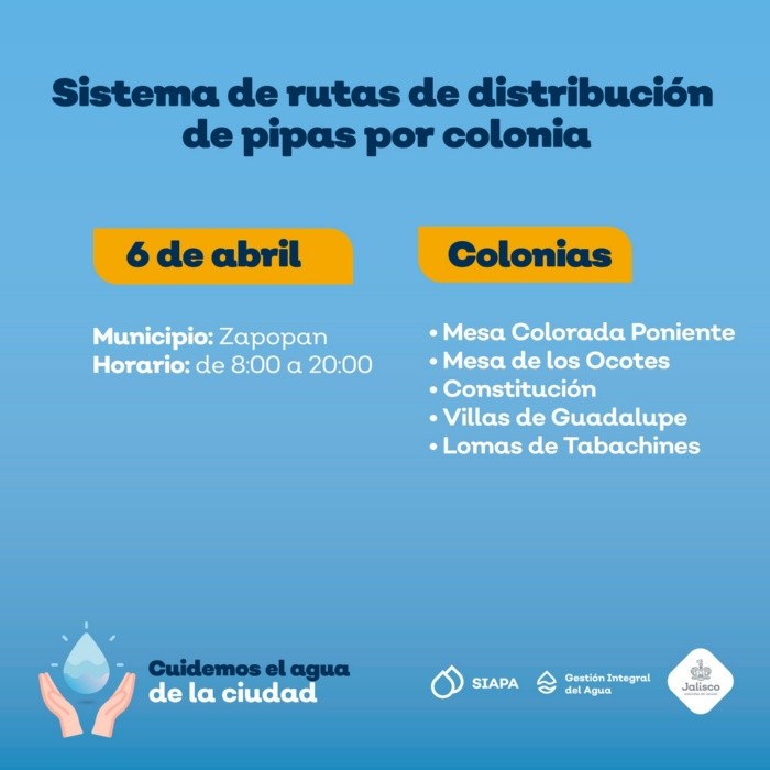 Ante la baja presión de agua que prevalece en algunas colonias de la Zona Metropolitana de Guadalajara, el Sistema Intermunicipal de los Servicios de Agua Potable y Alcantarillado (SIAPA) continúa con el sistema de rutas de pipas gratuitas por colonia implementado desde el pasado 18 de marzo.La distribución de pipas tiene el objetivo de minimizar las afectaciones a las colonias que se encuentran dentro del operativo de suministro rotatorio, estrategia de distribución diseñada debido a la escasez de agua en la Presa Calderón.Las zonas de cobertura y horarios de la flota de pipas para este martes 6 de abril es el siguiente:La distribución estará dentro de un horario de 08:00 a 20:00 horas. Ante el desabasto de agua el SIAPA exhorta a cuidar el vital líquido.NR
