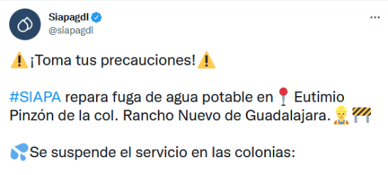 El Sistema Intermunicipal de los Servicios de Agua Potable y Alcantarillado (SIAPA) anunció la tarde de hoy lunes que habrá corte de agua para ocho colonias del municipio de Guadalajara.A través de redes sociales, el SIAPA informó que personal se encuentra reparando una fuga de agua que se registró en la calle Eutimio Pinzón, en la colonia Rancho Nuevo, del municipio de Guadalajara.Debido a esto, deberán realizar cortes de agua en algunas colonias de Guadalajara este lunes, sin embargo, se prevé normalizar el servicio la noche de este mismo lunes 22 de noviembre. El SIAPA invitó a la gente a realizar distintas acciones para el uso responsable y óptimo del aguaAnte cualquier duda o aclaración, el SIAPA pone a disposición los siguientes medios para que resuelvas tus preguntas. Facebook: siapagdl Twitter: siapagdl SIAPATEL: 3336682482GC