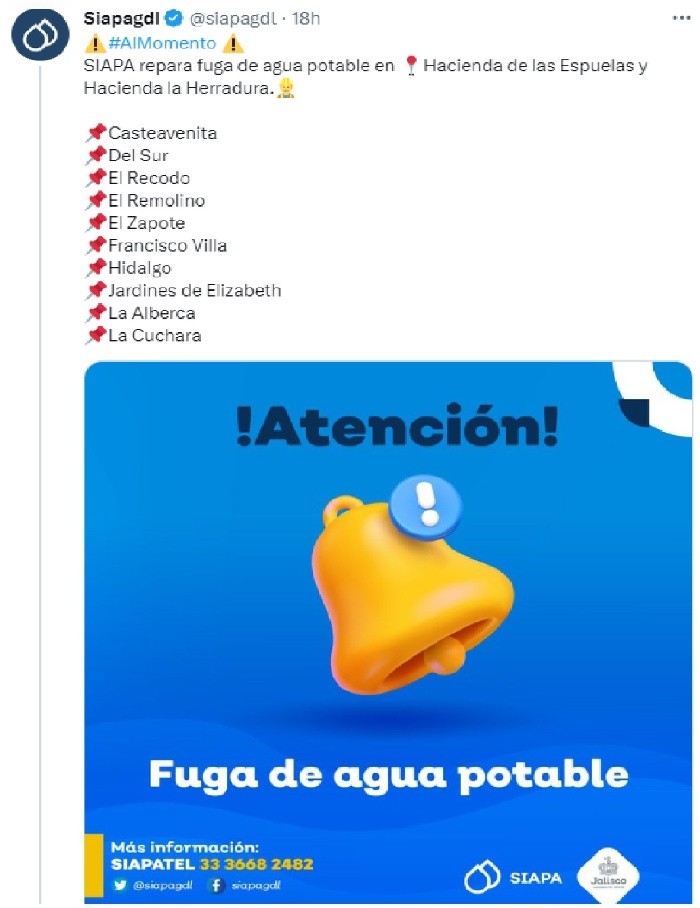 El Sistema Intermunicipal de los Servicios Agua Potable y Alcantarillado (Siapa) anunció que el servicio de agua se suspenderá en varias colonias de la Zona Metropolitana de Guadalajara debido a que se presentaron algunas fugas. Fue a través de sus redes sociales, donde el siapa informó que se encuentran reparando una fuga de agua potable en Hacienda de las Espuelas y Hacienda la Herradura.Por este motivo habrá corte de agua en las siguientes colonias: Siapa informó que el servicio se restablecerá el servicio de agua durante el transcurso del día lunes 20 de febrero.Ante cualquier duda o aclaración, el Siapa pone a disposición los siguientes medios para que resuelvas tus preguntas.MF