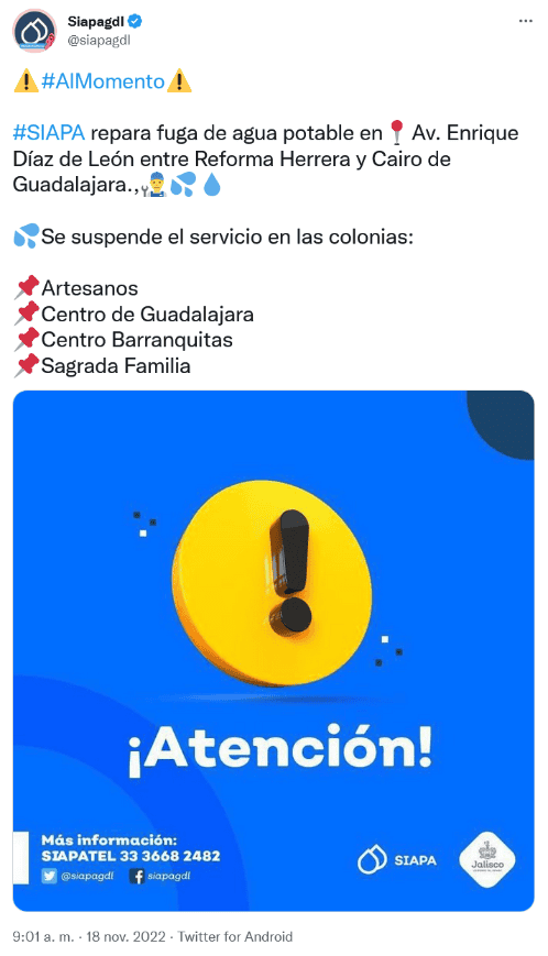La mañana de este viernes, el Sistema Intermunicipal de los Servicios de Agua Potable y Alcantarillado (SIAPA) anunció que habrá corte de agua para cuatro colonias del municipio de Guadalajara a partir de hoy viernes.A través de sus redes sociales, el SIAPA detalló que realizará la reparación de una fuga de agua potable en avenida Enrique Díaz de León, entre Reforma y Herrera y Cairo.Estos trabajos provocarán que haya corte de agua en las siguientes colonias de Zapopan: El SIAPA detalló que se prevé que la noche de este mismo viernes 18 de noviembre se restablezca el servicio.El SIAPA invitó a la gente a realizar distintas acciones para el uso responsable y óptimo del aguaAnte cualquier duda o aclaración, el SIAPA pone a disposición los siguientes medios para que resuelvas tus preguntas. Facebook: siapagdl Twitter: siapagdl SIAPATEL: 3336682482GC