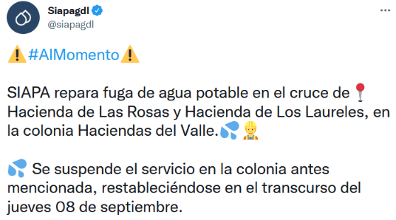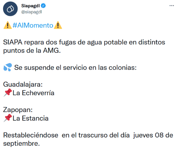 El Sistema Intermunicipal de los Servicios de Agua Potable y Alcantarillado (SIAPA) anunció hoy miércoles que habrá corte de agua para algunas colonias de los municipios de Guadalajara y Zapopan.A través de redes sociales, el SIAPA informó a las 11:00 horas de hoy que personal del SIAPA reparará una fuga de agua potable, por lo que habrá suspensión del servicio para una colonia de Guadalajara y otra más de Zapopan a partir de este miércoles. Se prevé que el servicio del agua regrese durante la tarde del jueves 8 de septiembre.GuadalajaraZapopanHoras después, el Siapa informó que repara otra fuga de agua en el cruce de Hacienda de Las Rosas y Hacienda de Los Laureles, por lo que suspenderán el servicio del agua en la colonia Haciendas del Valle, también en Zapopan.El corte será a partir de hoy miércoles 7 de septiembre y se reanudará en el transcurso de mañana jueves.El SIAPA invitó a la gente a realizar distintas acciones para el uso responsable y óptimo del aguaAnte cualquier duda o aclaración, el SIAPA pone a disposición los siguientes medios para que resuelvas tus preguntas. Facebook: siapagdl Twitter: siapagdl SIAPATEL: 3336682482GC