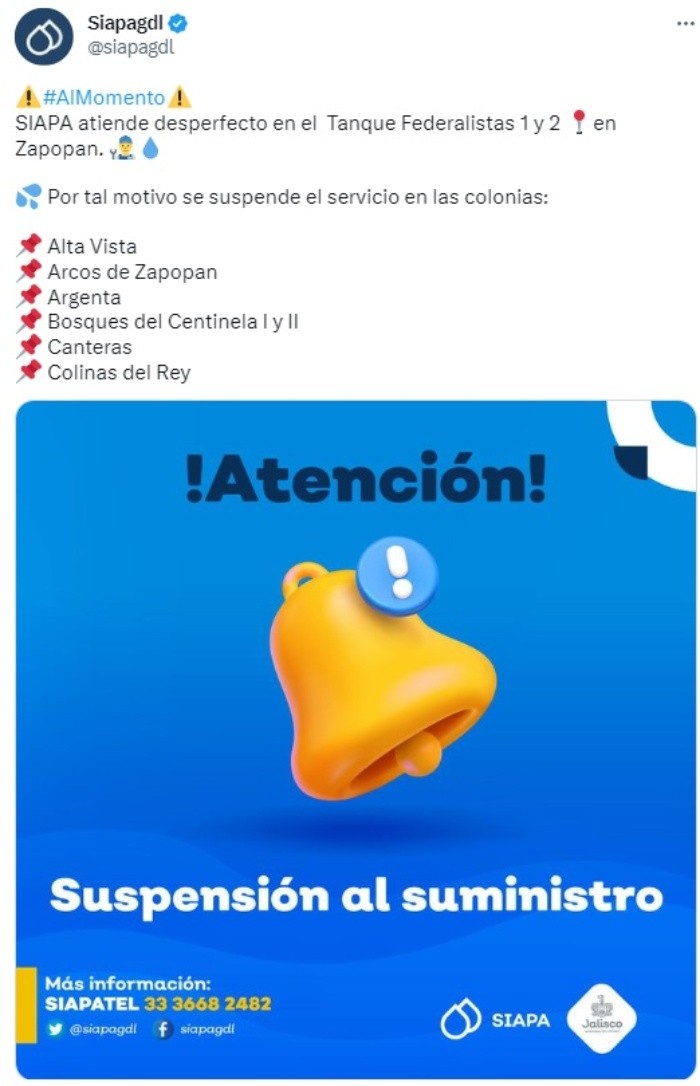 El Sistema Intermunicipal de los Servicios Agua Potable y Alcantarillado (Siapa) dio a conocer este jueves que el servicio de agua potable se verá afectado en varias colonias de Zapopan debido a que se encuentran reparando una falla en un tanque. Fue a través de las redes sociales, donde el Siapa informó que se encuentran atendiendo un desperfecto en el Tanque Federalistas 1 y 2 del municipio mencionado, por lo que habrá corte de agua en 20 colonias. Por este motivo se suspenderá el servicio en las siguientes colonias: Siapa informó que el servicio se restablecerá durante el transcurso del día sábado 11 de marzo. En caso de cualquier duda o alguna aclaración, el Siapa pone a disposición los siguientes medios para que resuelvas tus preguntas.MF