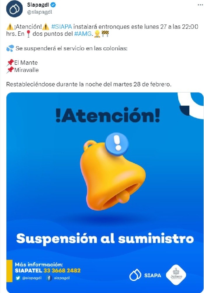 El Sistema Intermunicipal de los Servicios Agua Potable y Alcantarillado (Siapa) dio a conocer este lunes que el servicio de agua potable se verá suspendido en dos colonias de la Zona Metropolitana de Guadalajara. Fue a través de sus redes sociales en donde el Siapa informó que habrá corte de agua las colonias de El Mante y Miravalle debido a que se instalarán entronques la noche de este lunes 27 a las 22:00 horas. Se informó que el servicio regresará a la normalidad durante la noche del martes 28 de febrero. En las últimas horas, se anunció que de igual manera habrá corte de agua en algunas colonias del municipio de Tonalá, pues que se encuentran reparando una fuga de agua.Las colonias afectadas serán: Agua Escondida, Altamira, Fracc. Los Pájaros, Fracc. Los Limones, La Hortaliza, Loma Bonita, Lomas de La Soledad y Lomas del Camichin.El servicio se restablecerá durante la tarde de este martes.Ante cualquier duda o aclaración, el Siapa pone a disposición los siguientes medios para que resuelvas tus preguntas.MF