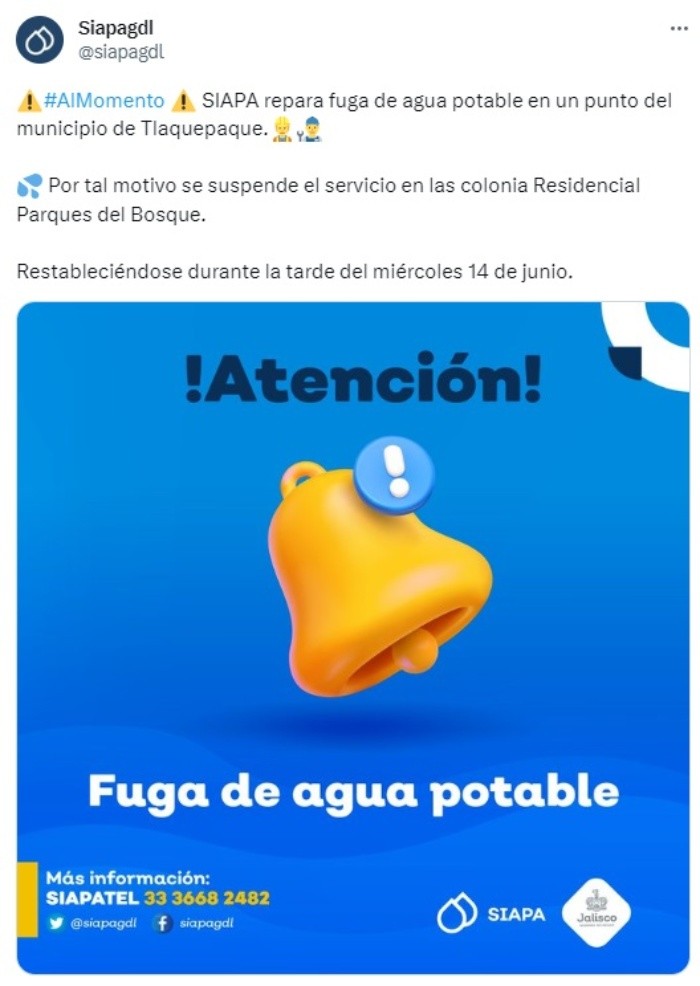 El Sistema Intermunicipal de los Servicios Agua Potable y Alcantarillado (Siapa) informó este martes que se suspenderá el servicio de agua potable en una colonia del municipio de Tlaquepaque debido a que se encuentran reparando una fuga. Fue a través de sus redes sociales, donde el Siapa informó que se encuentran reparando un fuga de agua en un punto del municipio de Tlaquepaque.Por tal motivo habrá corte de agua en la colonia Residencial Parques del Bosque, regresando el servicio a su normalidad durante la tarde del miércoles 14 de junio.Ante cualquier duda o aclaración, el Siapa pone a disposición los siguientes medios para que resuelvas tus preguntas.MF