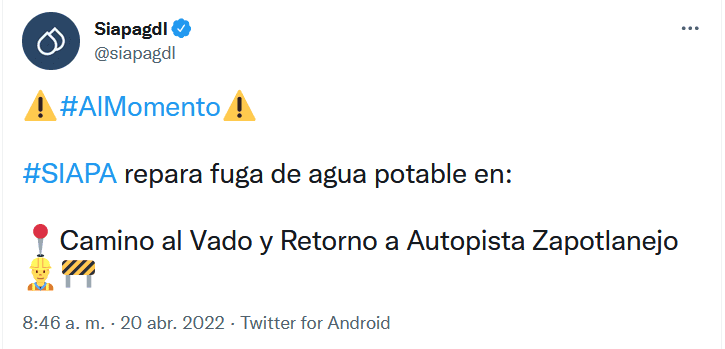 El Sistema Intermunicipal de los Servicios de Agua Potable y Alcantarillado (SIAPA) anunció la mañana de hoy miércoles que habrá corte de agua para cinco colonias.A través de redes sociales, el SIAPA informó que personal se encuentra reparando una fuga de agua que se registró en el Camino al Vado y Retorno a Autopista Zapotlanejo. Debido a esto, deberán realizar cortes de agua en algunas colonias; se prevé que el servicio regrese en el transcurso del día jueves 21 de abril.Este nuevo corte de agua ocurre a pocos días de haber suspendido el servicio en cientos de colonias de la Zona Metropolitana de Guadalajara (ZMG) durante Semana Santa.El SIAPA invitó a la gente a realizar distintas acciones para el uso responsable y óptimo del aguaAnte cualquier duda o aclaración, el SIAPA pone a disposición los siguientes medios para que resuelvas tus preguntas. Facebook: siapagdl Twitter: siapagdl SIAPATEL: 3336682482GC
