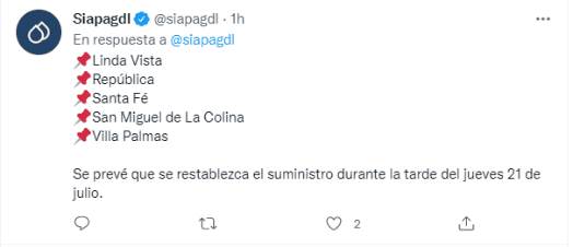 El Sistema Intermunicipal de los Servicios de Agua Potable y Alcantarillado (SIAPA) anunció la mañana de hoy miércoles que habrá corte de agua para ocho colonias del municipio de Zapopan.A través de redes sociales, el SIAPA informó que personal se encuentra reparando una fuga de agua que se registró en la cabecera municipal de Zapopan. Debido a esto, deberán realizar cortes de agua en algunas colonias de dicho municipio.Se prevé que el servicio regrese durante la tarde del jueves 21 de julio.El SIAPA invitó a la gente a realizar distintas acciones para el uso responsable y óptimo del aguaAnte cualquier duda o aclaración, el SIAPA pone a disposición los siguientes medios para que resuelvas tus preguntas. Facebook: siapagdl Twitter: siapagdl SIAPATEL: 3336682482GC