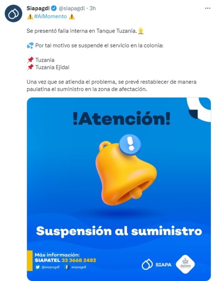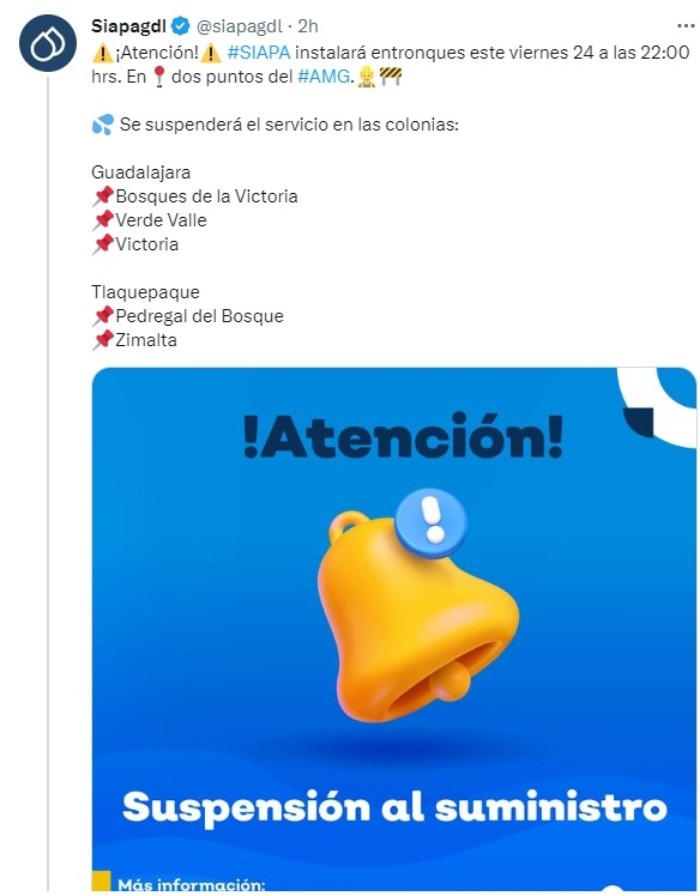 El Sistema Intermunicipal de los Servicios Agua Potable y Alcantarillado (Siapa) anunció este viernes a través de sus redes sociales que suspenderá el servicio de agua potable en cinco colonias de los municipios de Guadalajara y Tlaquepaque.A través de sus redes sociales en Twitter, el siapa mencionó que se instalará entronques este viernes 24 a las 22:00 hrs en dos puntos del Área Metropolitana de Guadalajara provocando el corte de agua en las siguientes colonias de los municipios ya mencionados.Estas serán las colonias afectadas: Siapa indicó que el servicio se restablecerá durante la noche del sábado 25 de febrero. Además se suspenderá el servicio de agua en las colonias Tuzania y Tuzania Ejidal, debido a que se presentó falla interna en Tanque Tuzania. El servicio volverá a su normalidad de manera paulatina. Ante cualquier duda o aclaración, el Siapa pone a disposición los siguientes medios para que resuelvas tus preguntas.MF