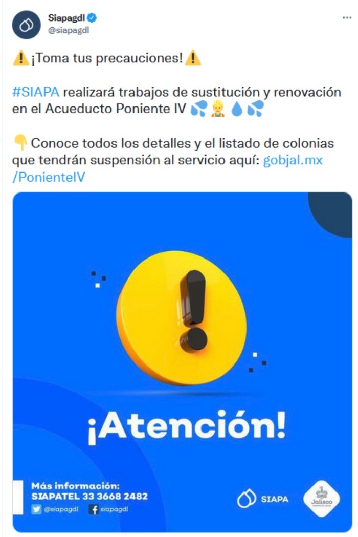 A más tardar del jueves 30 de diciembre, 160 colonias que se han quedado sin agua por mantenimiento en el sistema de distribución Poniente IV del Siapa, que ha afectado a barrios de Guadalajara, Tlaquepaque y Zapopan, esperan que quede restablecido el servicio.El Sistema Intermunicipal de los Servicios de Agua Potable y Alcantarillado (Siapa), desde el 25 de diciembre comenzó con trabajos de mantenimiento, sustitución y renovación de equipos en diversos puntos, por lo cual algunas colonias se han visto afectadas en la distribución del agua.Las acciones que se han llevado a cabo y que se siguen laborando son las siguientes:Las obras y el corte de agua comenzó desde el 25 de diciembre a las 21:00 horas y el Siapa señaló a través de sus redes sociales que llevará un esfuerzo de 40 horas interrumpidas, se prevé normalizar el servicio el 28 de diciembre aproximadamente a las 20:00 horas, se estarán restableciendo las conexiones parcialmente y totalmente pretenden terminar en las primeras horas del jueves 30 de diciembre.Además, explica el Siapa que en caso de falta de agua después del periodo en la línea de agua potable, se puede tratar de tomas tapadas o casos diferentes a las reparaciones.En caso de fugas o casos particulares se pueden comunicar al teléfono Siapatel es el 33 3668 2482 y en redes sociales Twitter: @siapagdl y Facebook: @SiapaGdl.Alcalde Barranquitas Americana Arboledas del Sur Ayuntamiento Balcones del Cuatro Capilla de Jesús Centro Barranquitas Centro de Guadalajara El Carmen El Refugio El Retiro El Sauz Emiliano Zapata Italia Providencia Jardines de San José Jardines del Sauz Ladrón de Guevara Lázaro Cárdenas Loma Verde Lomas de Polanco López Portillo Los Colorines Patria Nueva Polanco Prados Providencia Providencia Sagrada Familia Santa Teresita Torres de España Vicente Guerrero Villas del Sur Villaseñor12 de Diciembre Abadía Agua Blanca Agua Blanca Industrial Agua Blanca Sur Alcazar Oriente Alcazar Poniente Arcos de Guadalupe Arenales Tapatíos Arrayanes Habitat Atlas Chapalita Balcones del Sol Bosque Las Lomas Bosque Los Lagos Bosque Real Bugambilias Country Carlos Rivera Aceves Ceiba Chapalita Inn Coto Guadalupe Chapalita Las Fuentes Ciudad Granja Ciudad Judicial Condominio Plaza Guadalupe Coto Los Arrayanes Coto Los Manzanos Coto Los Naranjos El Aire El Campanario El Colli CTM El Colli Ejidal El Colli Urbano El Coto El Mante El Tizate Eucalipto Vallarta Fracc. Coto del Rey Fracc. Cristal Fracc. Vistas del Pinar Fracc. Nueva Galicia Fracc. Rinconada Santa Catalina Fracc. Oyamel Guadalupe Jardín Haciendas Tepeyac Jardines de Guadalupe Jardines de La Patria Jardines de Santa Ana Jardines Tapatíos Jardines Universidad La Cañada de Bugambilias La Castilla La Floresta del Colli La Florida La Gloria del Colli La Granja La Primavera Loma Bonita Ejidal Lomas de Guadalupe Lomas de La Primavera Lomas del Colli Lomas del Seminario Los Agaves Los Cajetes Los Patos Lugano Mariano Otero Mirador del Sol Miramar Misión Santa Ana Nimbus Hábitat Nueva Primavera Palmira Paraisos del Colli Parque de Las Azaleas Parque Industrial Colli Parques Tepeyac Pasos del Sol Prados Vallarta Puerta Aqua Puerta del Bosque Puerta del Roble Puerta Plata Real Vallarta Residencial Cordilleras Residencial del Parque Residencial Guadalupe Inn Residencial Haciendas de Guadalupe Residencial La Estancia Residencial Moctezuma Residencial Parque Sereno Rinconada de Guadalupe Rinconada del Iris Rinconada del Parque Rinconada Vallarta Royal Country Santa Catalina Santa María del Pueblito Trento Residencial Vallarta La Patria Vallarta Universidad Villa Esmeralda Villa La Cima Villa Puerta del Sol Villas Colón Villas de Otero Villas del Tepeyac Volcán del ColliArroyo de Las Flores Balcones de Santa María Cerro del Tesoro Guayabitos Indígena de San Sebastianito Jardines de Santa María Loma Linda Lomas de La Victoria Lomas de Santa María Lomas del Pedregal Mirador del Tesoro Nueva España Nueva Santa María Parques Colón Parques de Santa María Real Tulipanes San Sebastianito Santa Eduwiges Santa María Tres Pinos Valle de Las HerasOF