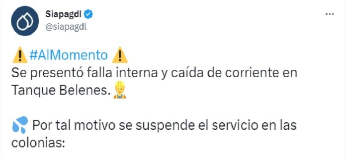 El Sistema Intermunicipal de los Servicios Agua Potable y Alcantarillado (SIAPA) anunció que habrá un nuevo corte de agua en varias colonias del municipio de Zapopan. A través su cuenta oficial de Twitter informó que esta noche del miércoles se tuvo que suspender el servicio debido a que se presentó una falla interna y caída de corriente en Tanque Belenes.Tras la falla que se presentó, estas colonias del municipio serán las que se verán afectadas, a continuación te dejamos la lista: Siapa anunció que el servicio regresará a su normalidad una vez que se atienda el problema; se prevé restablecer de manera paulatina el suministro en la zona de afectación.Para cualquier duda o aclaración, el Siapa pone a disposición sus redes sociales y número telefónico para resolver las preguntas de sus ciudadanos. MF