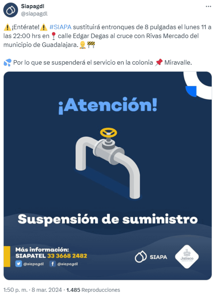 El Sistema Intermunicipal de los Servicios de Agua Potable y Alcantarillado (Siapa) ha emitido un comunicado informando sobre una suspensión programada del suministro de agua en una colonia del Área Metropolitana de Guadalajara para el próximo lunes 11 de marzo.Según lo anunciado por el Siapa, la suspensión del suministro de agua se debe a la necesaria sustitución de un entronque de ocho pulgadas, que se llevará a cabo en la calle Edgar Degas, ubicada en el cruce de Rivas Mercado.La sustitución del entronque está programada para iniciar el lunes 11 de marzo a las 22:00 horas, según las autoridades del Siapa. Esta interrupción del servicio afectará principalmente a la colonia Miravalle, compuesta por las siguientes calles y avenidas:Durante el tiempo que duren los trabajos, se espera que el suministro de agua potable se vea interrumpido en las vialidades mencionadas. El servicio se restablecerá el 12 de marzo, aunque el comunicado del Siapa no especifica la hora exacta.Se recomienda a los residentes y negocios de estas zonas tomar las medidas necesarias para almacenar agua y planificar en consecuencia durante el período de interrupción del servicio.SV