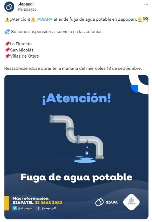 Este martes, el Sistema Intermunicipal de los Servicios Agua Potable y Alcantarillado (Siapa) reportó un corte de agua en algunas colonias del municipio de Zapopan. A través de sus redes sociales, el Siapa informó que se encuentran reparando una fuga de agua en un punto de la ciudad.Por tal motivo las colonias La Floresta, San Nicolás y Villas de Otero se verán afectadas con el servicio de agua potable. Se espera que el servicio de agua se restablezca durante la mañana del miércoles 13 de septiembre. Para cualquier duda o aclaración, el Siapa pone a disposición los siguientes medios para que resuelvas tus preguntas.MF