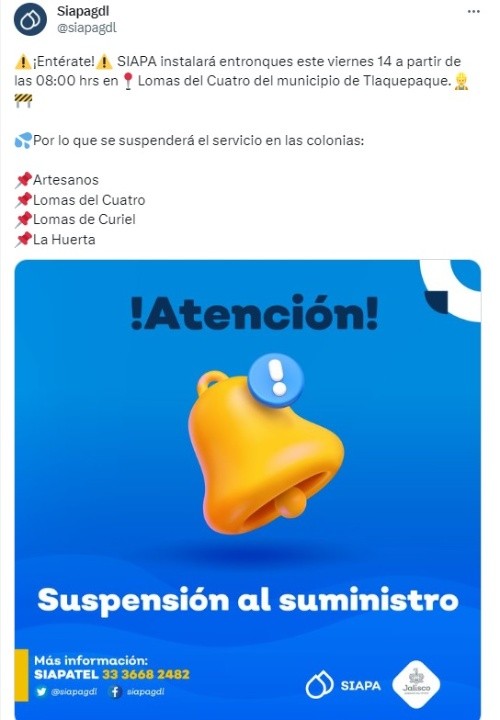 El Sistema Intermunicipal de los Servicios Agua Potable y Alcantarillado (Siapa) informó la tarde de este jueves que habrá otro corte de agua, ahora en el municipio de Tlaquepaque, esto debido a la instalación de entronques. A través de sus redes sociales, el Siapa informó que instalará entronques este viernes 14 a partir de las 08:00 horas en la colonia Lomas del Cuatro del municipio de Tlaquepaque.Por este motivo, las siguientes cuatro colonias se verán afectadas con el servicio de agua potable: El servicio será restablecido durante la tarde del sábado 15 de julio. En caso de cualquier duda o aclaración, el Siapa pone a disposición los siguientes medios para que resuelvas tus preguntas.MF