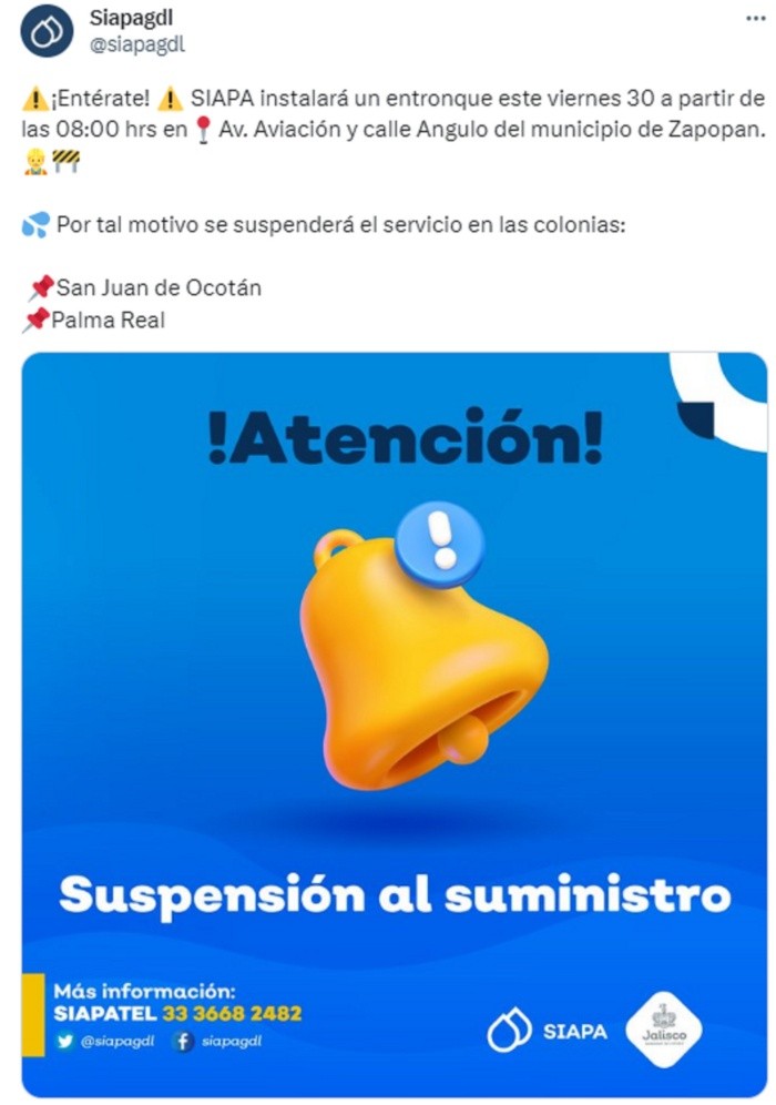 Nuevamente el Sistema Intermunicipal de los Servicios Agua Potable y Alcantarillado (Siapa) informó que habrá corte de agua en dos colonias del municipio de Zapopan, pues se instalará un entronque. El Siapa anunció en sus redes sociales que se instalará un entronque el próximo viernes 30 de junio a partir de las 08:00 horas en Av. Aviación y calle Angulo del municipio de Zapopan.Por este motivo habrá corte de agua en las colonias de San Juan de Ocotán y Palma Real. Se espera que el servicio de agua potable vuelva a su normalidad durante las primeras horas del sábado 1 de julio.En caso de cualquier duda o aclaración, el Siapa pone a disposición los siguientes medios para que resuelvas tus preguntas.MF