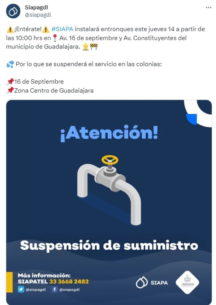 El Sistema Intermunicipal de los Servicios Agua Potable y Alcantarillado (Siapa) anunció este miércoles un nuevo corte de agua previo a los festejos de las Fiestas Patrias, afectando a colonias del centro histórico de la ciudad de Guadalajara. A través de sus redes sociales, Siapa informó que se suspenderá el servicio debido a la instalación de entronques este jueves 14 a las 10:00 horas en Av. 16 de septiembre y Av Constituyentes.Por tal motivo las colonias que no contarán con agua son las colonias 16 de Septiembre y Zona Centro de Guadalajara. Se espera que el servicio de agua potable se restablezca durante las primeras horas del viernes 15 de septiembre. Para cualquier duda o aclaración, el Siapa pone a disposición los siguientes medios para que resuelvas tus preguntas.MF