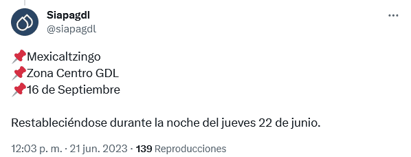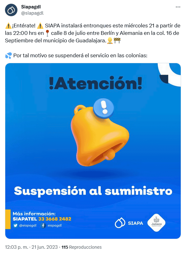 El Sistema Intermunicipal de los Servicios Agua Potable y Alcantarillado (Siapa) informó que hoy 21 de junio instalarán entronques este miércoles 21 de junio a partir de las 22:00 horas en la calle 8 de julio entre Berlín y Alemania en la colonia 16 de Septiembre del municipio de Guadalajara, por lo que se suspenderá el servicio en 3 colonias de la ZMG.Las afectadas serán las colonias Mexicaltzingo, Zona Centro y 16 de septiembre.En sus redes sociales, el Siapa indicó que una vez que se atienda, se prevé restablecer de manera paulatina el suministro durante la noche del jueves 22 de junio.Ante cualquier duda o aclaración, el Siapa pone a disposición los siguientes medios para que resuelvas tus preguntas.***OF