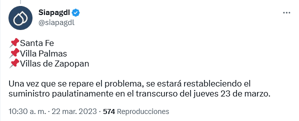 El Sistema Intermunicipal de los Servicios Agua Potable y Alcantarillado (Siapa) informó que hoy 22 de marzo se reparan fugas en diferentes puntos del municipio de Zapopan, por lo que se suspenderá el servicio en más de 20 colonias.Las afectadas serán las colonias Altamira, Bosques del Centinela I y II, Canteras, Colinas del Rey, Francisco Villa, Guadalajarita, Jacarandas, Las Palmas, Loma Blanca, Los Almendros, Maestros y Empleados, Mirador San Isidro, Misión del Bosque, Misión San Isidro, Parques del Centinela, Rancho El Centinela, Real del Bosque, Real Valdepeñas I y II, San Isidro, San Miguel de La Colina, Santa Fe, Villa Palmas, y Villas de Zapopan.En sus redes sociales, el Siapa indicó que el servicio se restablecerá en el transcurso del jueves 23 de marzo.Ante cualquier duda o aclaración, el Siapa pone a disposición los siguientes medios para que resuelvas tus preguntas.***OF