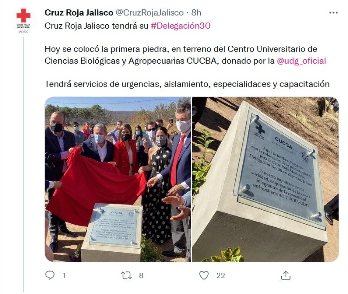 Este martes fue colocada la primera piedra de lo que serán las instalaciones de la Cruz Roja Mexicana en el municipio de Zapopan, instaurando así la delegación de esta organización en el municipio.El vicepresidente nacional y delegado en Jalisco de Cruz Roja Mexicana, Miguel Ángel Domínguez Morales, representó a la institución humanitaria con poco más de 100 años de historia en la colocación de dicho símbolo, que representa el inicio de la construcción de la delegación número 30 de la Entidad.Esta nueva delegación, informó la institución a través de un comunicado, estará ubicada en el Centro Universitario de Ciencias Biológicas y Agropecuarias de la Universidad de Guadalajara (UdeG), por camino Ramón Padilla Sánchez número 2100, en la colonia Las Agujas.El inmueble será edificado sobre un terreno de cinco mil metros cuadrados que fue donado por la casa de estudios, y contará con servicio de urgencias, área de aislamiento, consultorios de especialidades, áreas de capacitación y de gobierno.“El acto protocolario de colocación de la primera piedra fue realizado en el marco del Informe del Rector del Centro Universitario de Ciencias Biológicas y Agropecuarias de la Universidad de Guadalajara, Carlos Beas Zárate, con la presencia del Rector General universitario, Ricardo Villanueva Lomelí, y del presidente del patronato de construcción de esta nueva Delegación, el empresario José Ernesto Ceballos Gallardo, miembros de la familia Michel y Denise de Font Reaulx.“La zona de cobertura de esta nueva delegación de Cruz Roja, tiene alta densidad vehicular —incluye a la Carretera Federal 15—, pero también industrial, comercial y de vivienda, en la que esta Institución honrará su misión de prevenir y aliviar el sufrimiento humano, en beneficio directo de por lo menos 200 mil personas, incluidos ocho mil 500 miembros de la comunidad universitaria del CUCBA y 90 mil habitantes de la zona Oriente de Zapopan”, finalizó el organismo. JM