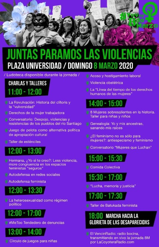 Bajo el lema de "¡El 9 (de marzo) ninguna se mueve!" con #UnDíaSinNosotras se invita a participar a todas las mujeres sin importar su edad a realizar paro en sus actividades. La intención es que con su ausencia se visibilice la situación de la violencia contra mujeres. Pero ¿De dónde surge la iniciativa? Lupita Ramos, coordinadora del Comité de América Latina y El Caribe para la Defensa de los Derechos de la Mujer en México (CLADEM), explica que la iniciativa surgió en el Encuentro Feminista Latinoamericano de 2016 que tuvo sede en Montevideo, Uruguay. La iniciativa propone hacer huelga general de mujeres cada 8 de marzo y agrega que: "Debido a que en esta ocasión el ocho será domingo, se convoca al paro en lunes nueve para que tenga efectos en la vida laboral y social". A la iniciativa surgida en el encuentro feminista y que busca tener un impacto a lo largo de América Latina, se integran diversos colectivos feministas de todo el país y ciudadanía en general. La invitación a participar se ha hecho por redes sociales desde distintos colectivos por lo que algunas usuarias de redes sociales expresaron su incertidumbre sobre quien o quienes enmarcaban el movimiento. Se espera que, a lo largo del país, el día 8 de marzo se realicen actividades y manifestaciones, mientras que el día nueve se realice el paro de actividades.En México, según datos del Secretariado Ejecutivo del Sistema Nacional de Seguridad Pública el número de mujeres víctimas de homicidio doloso en 2019 fue de 2 mil 819, mientras que el número de asesinatos a mujeres por feminicidio son mil 006, lo que da como resultado un total de 3 mil 825 mujeres asesinadas en el país y promedia más de 10 mujeres asesinadas al día.En el caso de Jalisco, el SESNSP revela que en 2019 hubo 229 mujeres víctimas de homicidio doloso y 54 mujeres víctimas de feminicidio. En Jalisco se unen colectivos feministas y de familiares desaparecidos La Asamblea "Yovoy8demarzo" integrada por los colectivos: Me cuidan mis amigas Gdl, Femibici, Vulvurina, Lavanda, Cetien México, Antimusas, Batukada Feminista, Cladem Jalisco, Género y Lucha de Clases, y Cuerpos parlantes espacio feminista y de investigación urbana, han decidido expandir sus acciones y enlazar con diferentes movimientos de resistencia para fortalecer los vínculos entre colectivos feministas, familias de personas desaparecidas y familiares víctimas de feminicidio. Yovoy8demarzo describe en su comunicado que ante la ineptitud e indiferencia del Estado han sido las familias quienes lideran las acciones de búsqueda, procuración de seguridad y exigencia de justicia, y que es por ello que se unen al grito de "Por una vida digna y libre de violencias" y porqué "Sin nuestrxs desaparecidxs, sin sus vidas, sin sus cuerpos, no puede haber lucha por los derechos laborales, reproductivos, sexuales y educativos". La asamblea invita este próximo domingo 8 de marzo en Plaza Universidad a una jornada de charlas y talleres desde las 11:00 horas y a las 18:00 horas realizar la marcha para "Juntas parar la violencia" con rumbo a la Glorieta de las y los desaparecidos.LS