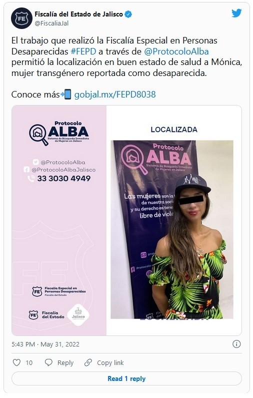 Acababan de salir del punto de reunión para exigir a las autoridades que encontraran a Moni, la joven transexual vista por última vez el pasado 19 de abril en el municipio de Tlaquepaque, cuando Gabriela, su mamá, recibió una llamada por parte de la Fiscalía de Jalisco para informarle que ya había sido localizada.Familiares y amigos habían iniciado la protesta en el Parque Revolución, en el Centro de Guadalajara, para llegar a Plaza Liberación, sin embargo, no habían avanzado ni tres cuadras cuando, tras recibir la noticia, decidieron cambiar el rumbo para llegar lo antes posible a la Fiscalía Especial en Personas Desaparecidas, ubicada en la Calzada Independencia, donde se encontraba la joven de 23 años.Al lugar entraron Gabi y su prima Julieta, quienes confirmaron que la joven localizada era Moni, y tras aproximadamente hora y media salió la joven con su familia y amigos, quienes la esperaban afuera del recinto, para agradecerles que la buscaran, aunque evitó entablar comunicación alguna con los medios.Con ella no salieron ni su mamá ni su tía. Tras abrazar a sus seres queridos, se fue caminando sobre la Calzada Independencia con rumbo la avenida Juárez.De acuerdo con la Fiscalía del Estado, y según la carpeta de investigación, la última vez que Gabi supo de Mónica fue el 19 de abril, cuando la llamó y le informó que le habían robado su celular pero que se encontraba bien.“La joven y su mamá mantuvieron comunicación en distintos momentos durante su ausencia además que le mencionó que estaba buscando un lugar para vivir en la zona Centro de Guadalajara, pero al no tener noticias de la joven, Gabi decidió acudir a presentar su denuncia".Según afirmó la dependencia, tras confirmar que se hallaba en buen estado de salud, se informó al personal que su ausencia fue voluntaria, “al igual que en el 2019 que fue localizada luego de ausentarse de su casa”. Tras haberse reunido con la joven Gabi se dijo feliz de haber dado con su paradero y aseguró que Moni decidió adelantarse a casa, donde más tarde platicará con ella sobre lo sucedido. "Desde que me marcaron fue sorpresivo, no me esperaba que el día de la marcha nos fueran a decir que ya estaba aquí. Pero que bueno que dentro de todo que ya la encontraron y está con nosotros. Ahorita no pudimos platicar mucho, pero ya en casa podremos platicar más tranquilas", expresó Gabriela. Aunque dijo, las autoridades no le dieron detalles sobre cómo llegó Moni a las instalaciones de la Fiscalía Especial en Personas desaparecidas, señaló que fue el Ministerio Público quien le hizo saber que su hija ya había sido localizada, y añadió, ambas continuarán con apoyo psicológico tras lo sucedido.JM