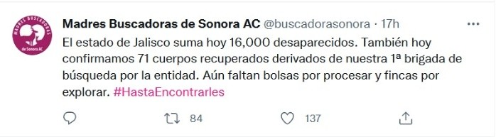 Aunque el pasado 8 de marzo las Madres Buscadoras de Sonora afirmaron que la Fiscalía de Jalisco confirmó 59 cuerpos exhumados, hoy la dependencia afirmó que como resultado de las labores de búsqueda se localizaron los cuerpos de 44 Personas Fallecidas Sin Identificar (PFSI), así como un lote de huesos que los peritos forenses dictaminaron pertenecían a un canino.La dependencia también destacó que esta cifra es preliminar y podría modificarse en los próximos días debido a que aún quedan pendientes de procesar cinco bolsas por parte del Instituto Jalisciense de Ciencias Forenses, labor que culminará en los próximos días.Hoy también, el colectivo aseguró en redes sociales que podrían ser más de 70, derivados de su primera brigada de búsqueda por la entidad.Aunque la Fiscalía señaló que las labores de búsqueda en nueve fincas a través de mandamiento judicial otorgados por el órgano jurisdiccional, así como tres predios abiertos, concluyeron en días pasados, el colectivo adelantó que aún faltan bolsas por procesar y fincas por explorar.Este viernes, Jalisco sumó 16 mil 001 personas desaparecidas y no localizadas, esto de acuerdo con el último corte del 11 de marzo del 2022 de la Comisión Nacional de Búsqueda.JM