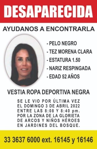 Lourdes Aguilar, de 52 años, desapareció el domingo 3 de abril. Fue vista por última vez por la zona de la Glorieta Arcos y Niños Héroes, en la colonia Jardines del Bosque, del municipio de Guadalajara.Según información preliminar, Lourdes Aguilar desapareció entre las 20:00 horas y 20:40 horas del pasado domingo. Vestía ropa deportiva en color negro.Lourdes es de complexión media, tez morena clara, cabello color negro, ojos negros.Si tienes información de su paradero, puedes comunicarte a la Fiscalía de Personas Desaparecidas al teléfono 3338376060 ext. 16714 y también al 3336376000 ext. 16145 y 16146.O también a la Comisión de Búsqueda del Estado de Jalisco al teléfono 3315145422.GC
