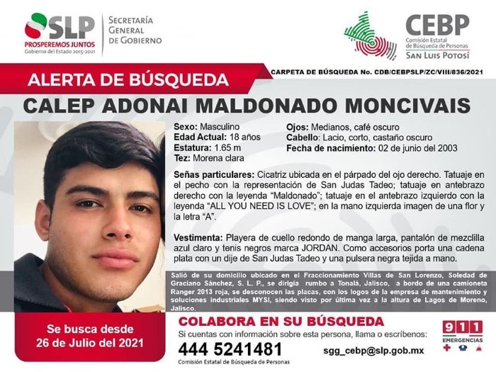 Cuatro jóvenes residentes en el estado de San Luis Potosí están desaparecidos desde el pasado 26 de julio, cuando partieron de sus domilicios rumbo a Tonalá, en Jalisco. El último lugar en que se les vio fue en el municipio jalisciense de Lagos de Moreno por lo que la Comisión Estatal de Búsqueda de Personas de San Luis Potosí (CEBP) emitió una alerta por su desaparición. La Comisión de Búsqueda de Personas de Jalisco también emitió cédulas para su búsqueda.Los jóvenes desaparecidos fueron identificados com Calep Adonai Maldonado Moncivais, de 18 años; Israel Andrade Hernández, de 20; Alan Michel Martínez Vargas, de 23, y Jorge Rodríguez Ortiz, de 24.La CEBP detalló que se trasladaban a Tonalá en una camioneta Ranger 2013 roja, cuyas placas no se conocen, la cual muestra logotipos de la empresa MYSI.En caso de tener alguna información sobre el paradero de los jóvenes, se pide llamar al 33 3145 6314 o al 444 524 1481.O bien, escribir al correo: sgg_cebp@slp.gob.mxSi te interesó esta noticia y quieres saber más, entonces descarga y descubre INFORMAPlus, la aplicación digital de EL INFORMADOR, en donde tenemos contenidos exclusivos, seleccionados por nuestros editores, para darles una experiencia más completa a los lectores. Descarga la aplicación y pruébala GRATIS por treinta días. Para iOS: https://apple.co/35jaVgbPara Android: https://bit.ly/3gwVSEVSi eres suscriptor de EL INFORMADOR tu acceso está incluido, solicítalo al 33 3678-7777IM