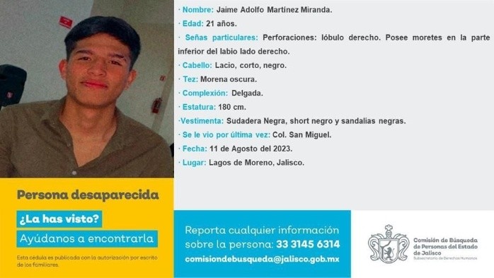Elementos de la Fiscalía del Estado realizan operativos en el municipio de Lagos de Moreno para localizar a cinco jóvenes desaparecidos desde el viernes por la noche. Familiares y amigos de las víctimas realizaron una manifestación la mañana de este domingo para exigir su localización y eligieron para protestar el medio tiempo del partido de la Copa Jalisco entre Lagos de Moreno y Teocaltiche.Debido a que esta copa se encuentra en semifinales, estaba presente el alcalde Tecutli Gómez, quien afirmó que el municipio trabaja con el gobierno del Estado para encontrar a los cinco amigos y revisan las cámaras de seguridad del municipio para seguir sus movimientos.Los desaparecidos fueron identificados como Roberto Olmeda Cuéllar; Diego Lara Santoyo, Uriel Galván, Jaime Adolfo Martínez Miranda y Dante Hernández, cuyas edades oscilan entre los 20 y 21 años, quienes fueron vistos por última vez la noche del viernes cuando viajaban en un Volkswagen Jetta en color café con placas JTJ-8638. Se informó que los jóvenes acudirían a una feria en Lagos de Moreno, pero desde entonces no se sabe nada de ellos.La Fiscalía Especializada en Personas Desaparecidas (FEPD) emitió una publicación a través de sus redes sociales donde afirma que el caso es investigado y se realizan operativos. Sin embargo, sólo se ha publicado la ficha de búsqueda de uno de ellos, Jaime Adolfo Martínez Miranda. Los familiares que se manifestaron la mañana de este domingo acusaron desinterés de las autoridades para hallar a los jóvenes. El padre de uno de los jóvenes mencionó que en la comunidad de San Miguel se localizó una mancha de sangre que podría estar relacionada a la desaparición, pero la autoridad no le dio seguimiento a la evidencia.“Se pidió que buscaran por los celulares, por ser iPhone. Pero dijeron que no, que del (viernes) 11 para abajo no se pueden rastrear. De hecho tuvimos que llevar al compañero, a una persona, para que nos ayudaran a buscarlo. Es completamente ilógico que una dependencia de ese tamaño no tenga una persona que pueda hacer eso”, criticó el padre de uno de los muchachos.Es la segunda desaparición colectiva en la Región Altos en menos de un mes. Entre el 27 y 28 de julio, cuatro mujeres desaparecieron en el municipio de Encarnación de Díaz, municipio contiguo a Lagos de Moreno. Las víctimas son las hermanas Adriana, Rosa Olivia y Marisela de apellidos Saucedo Zermeño, así como Beatriz Hernández Martínez, pareja de Rosa Olivia. MF