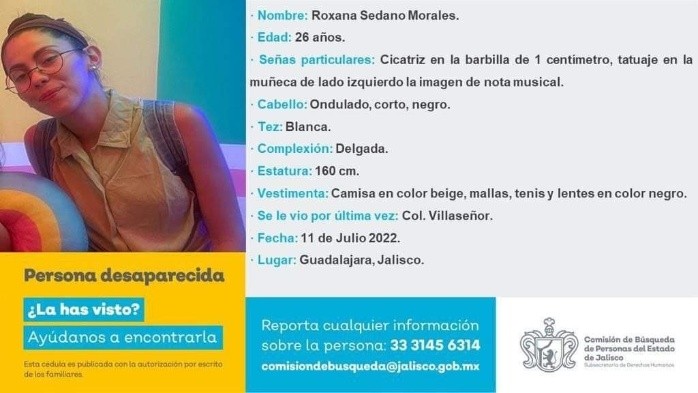 Roxana Sedano tiene 26 años de edad y una hija de seis. Anoche salió de su casa para ir a comprarle un poco de leche y que pudiera cenar, pero no regresó.“Como si hubiera tenido un presentimiento, a los 10 minutos que se fue su niña empezó a llorar y a preguntar por su mamá. En ese momento nos salimos a buscarla, nunca llegó a la tienda”, contó una de sus familiares.De acuerdo con la ficha emitida por la Comisión Estatal de Búsqueda, Roxana es blanca y delgada, mide 1.60 metros y tiene el cabello corto, ondulado y en color negro. Además tiene una cicatriz en la barbilla y un tatuaje de una nota musical en en la muñeca.De acuerdo con su familiar, Roxana salió de la casa alrededor de las 10:00 de la noche para ir a una tienda cercana en la colonia Villaseñor de Guadalajara. Según las cámaras de vecinos, ella caminó por la calle por donde habitualmente llegan, pero antes dio vuelta en otra vía y después no se supo nada de ella.“Se salió sin celular porque así acostumbramos cuando vamos a la tienda. Creímos que había ido a entregar algo de lo que vende por Facebook pero no sabemos nada de ella. Ningún vecino nos ha dicho si la vio, si vio algo raro. Yo sé que ella hubiera gritado”, contó la familiar.Ante el desconocimiento de su paradero la familia de Roxana puso el reporte debido en la Comisión Local de Búsqueda, fueron policías tapatíos a indagar en la zona, pero no hay más información de dónde está. La denuncia también ha sido presentada ante la Fiscalía Estatal, señaló la familia.“Es una mamá, es una hija, una hermana, todos la necesitamos aquí. Ya es un día completo y el tiempo corre y no sabemos nada de ella. No se la pudo haber tragado la tierra. Que nos ayuden con la poca o mucha información que tengan, y si alguien la tiene que por favor nos la regrese, que la deje ir”, lamentó la mujer.Aunque algunas personas intentaron extorsionar a la familia para pedirles dinero “a cambio de devolverla”, hasta el momento se desconoce dónde se encuentra Roxana. Llevaba puesta una camisa en color beige, mallas, tenis y lentes con armazón negro.En caso de tener información que pueda abonar a localizar a la joven, las personas pueden llamar de manera anónima al 333145 6314 o al 911.JM